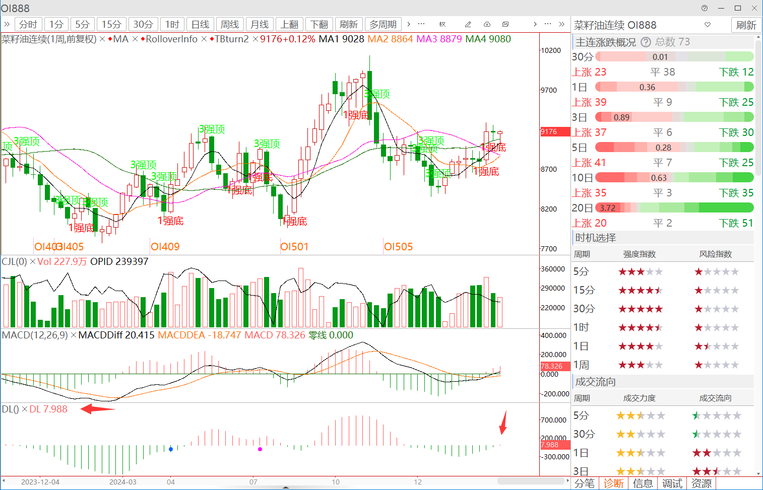 菜油主连的的周线, 动量要上0轴了, 虽然还有明天一天, 但这是个好现象, 切换到日线