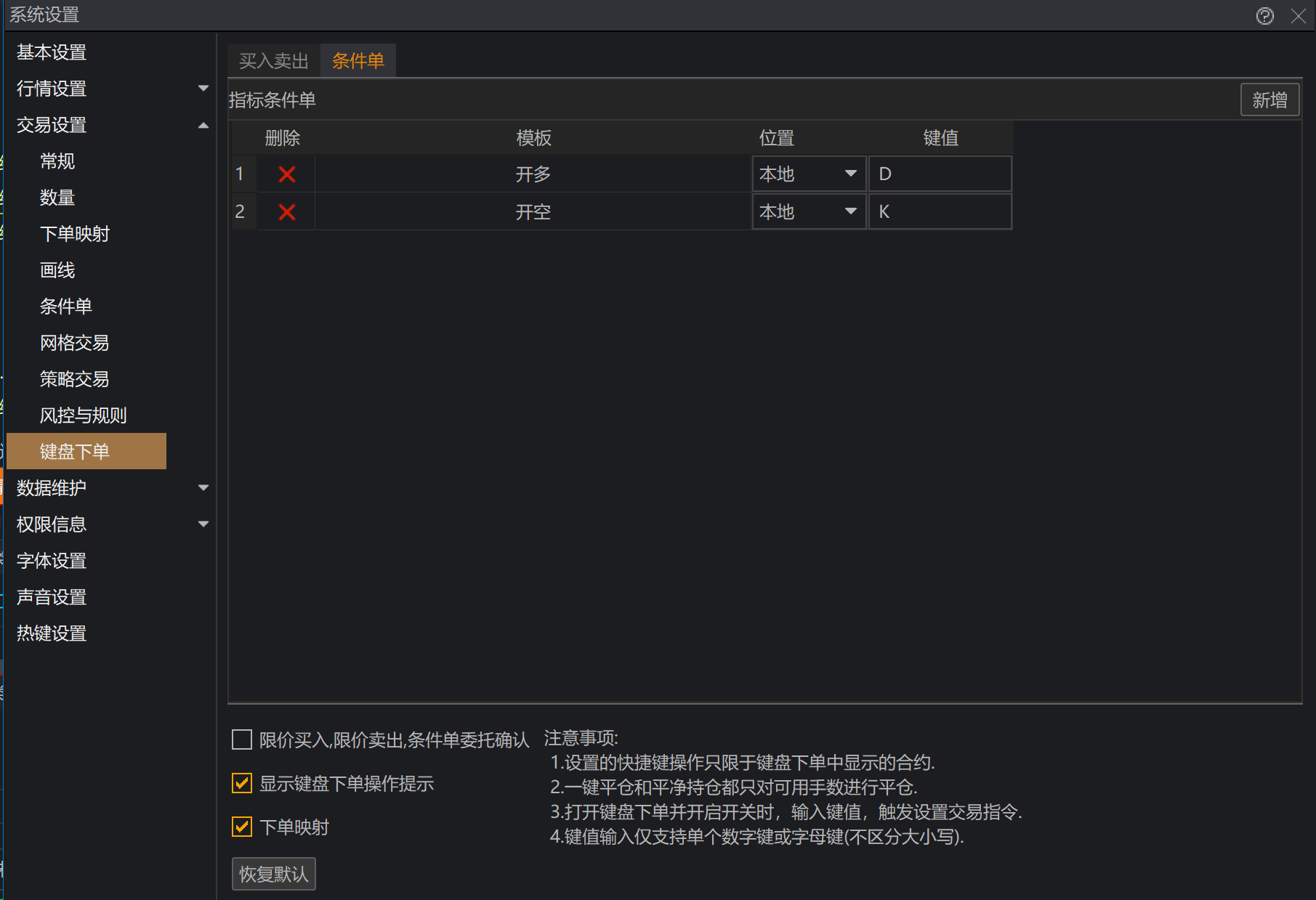 智大领峰设条件单,设键盘下单就可以一键开仓了,TBQ3没有,实盘帐户频繁掉线修改TCp地址已解决。