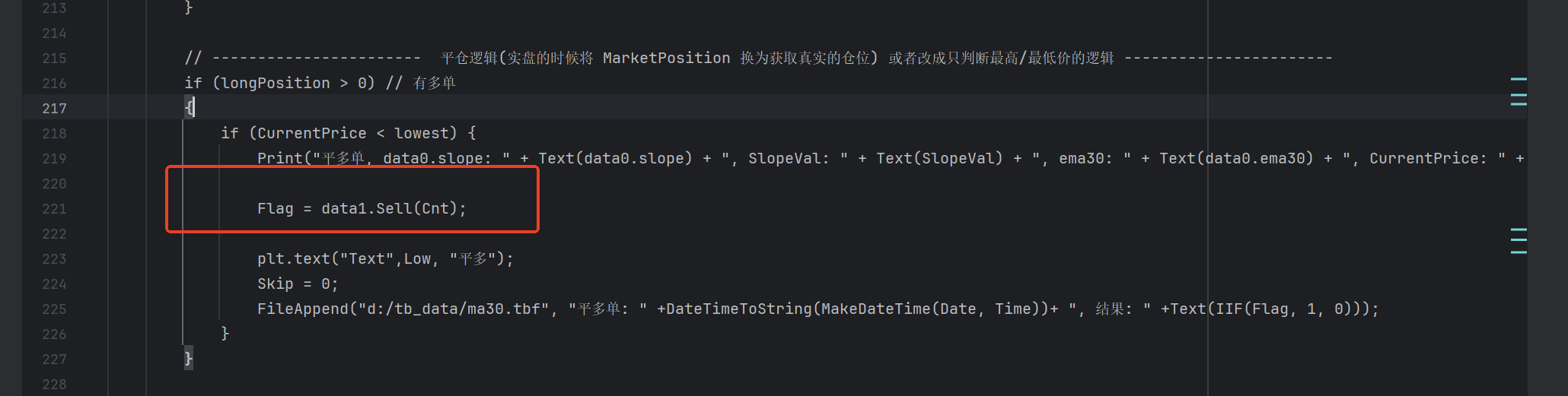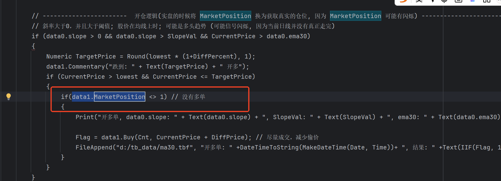FileAppend("d:/tb_data/ma30.tbf", "开多单: " +DateTimeToString(MakeDateTime(Date, Time))+ ", 结果: " +Text(IIF(Flag, 1, 0)));