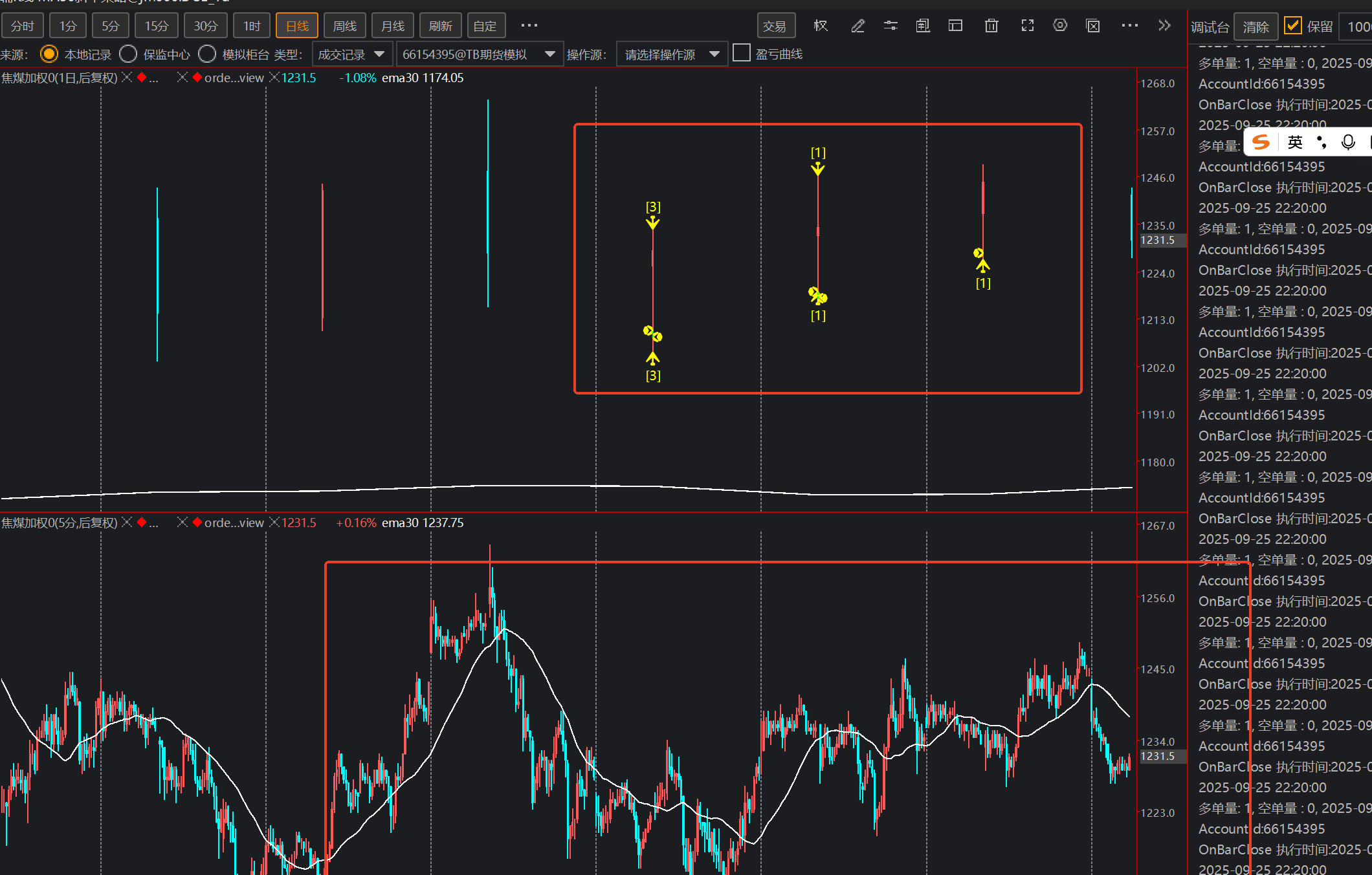 但是改为 A_GetPosition(mainSymbol, pos); 判断仓位以后,在分钟图上就不显示信号了,信号跑到日线图上了,如下图: