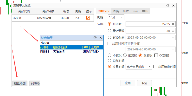 使用键盘添加:可以快速指定一个具体合约添加进来,我们选择rb888