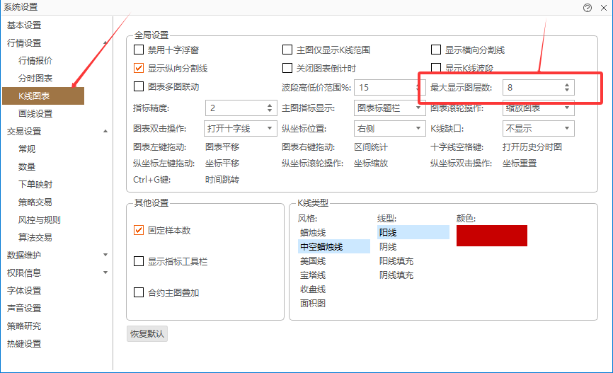 如何K线图显示超过4个图层,右上角系统设置里