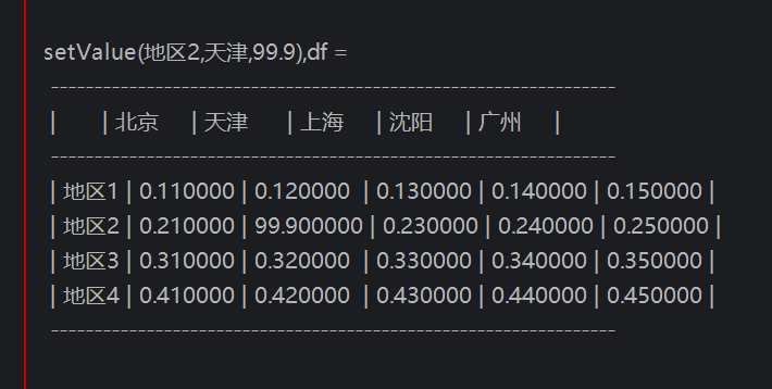 print("setILoc(1,[:],[10.1,10.2,10.3,10.4,10.5]),df = ");