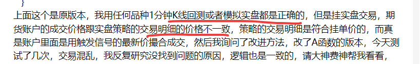 上面这个是原版本,我用任何品种1分钟K线回测或者模拟实盘都是正确的,但是挂实盘交易,期货账户的成交价格跟实盘策略的交易明细的价格不一致,策略的交易明细是符合挂单价的,而真是账户里面是用触发信号的最新价撮合成交,然后我询问了改进方法,改了A函数的版本,今天测试了几次,交易混乱,我反复研究没找到问题的原因,逻辑也是一致的,请大神费神帮我看看,给我改进的意见,让我实盘能与上面的策略保持一致,非常感谢,熬了几个晚上了,跪求。下面是改的A函数的版本。