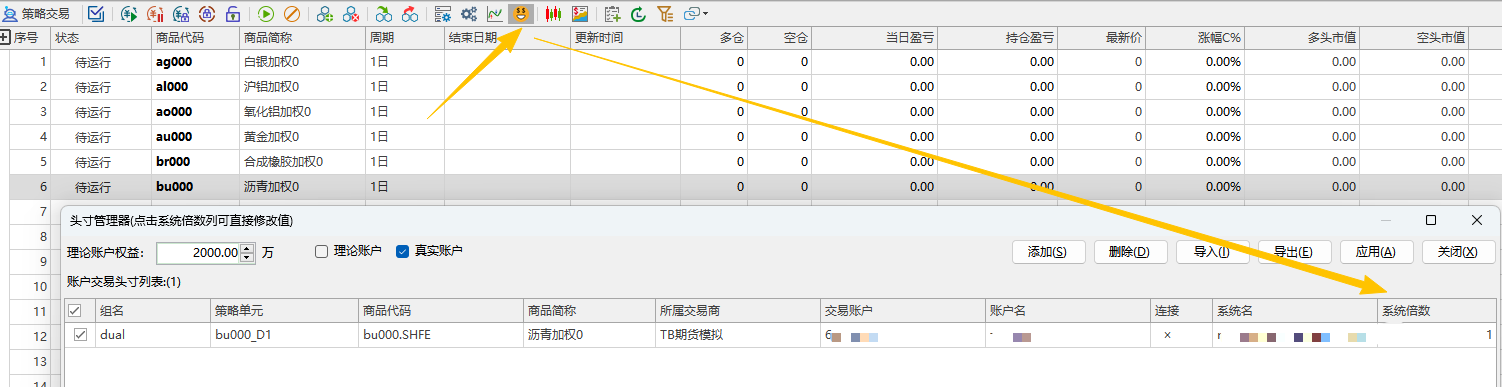 在同一个工作区中,有6组K线图,其中3组K线图,是A品种,分别有3个策略。 另外3组K线是对应的B品种,也是有3个策略。这6个策略内部代码是定义的1手,我的问题是,如何通过TBQ的设置,把A品种的3个策略,触发的时候,默认开仓2手,而B品种策略触发的时候,默认开仓3手。