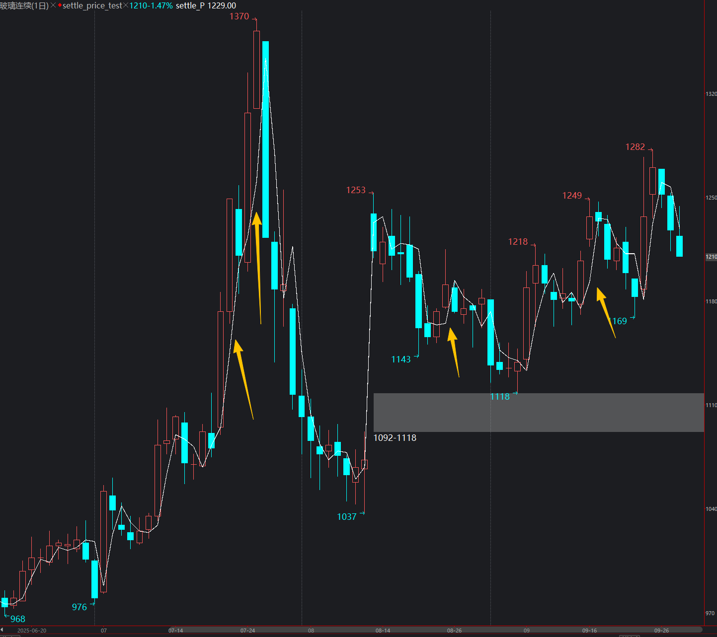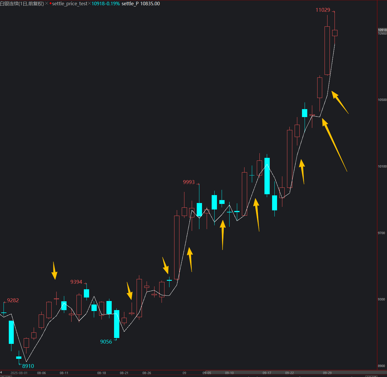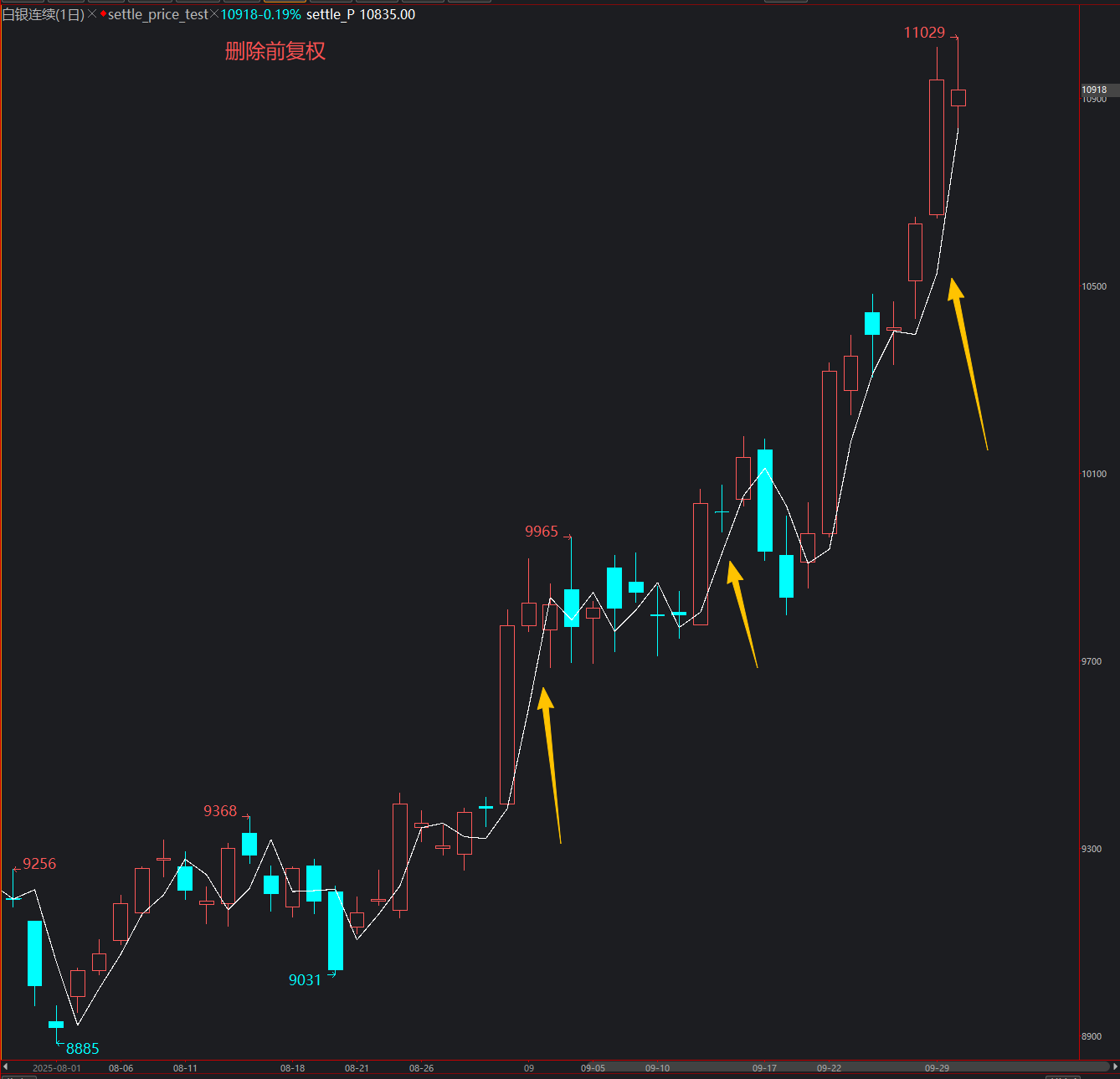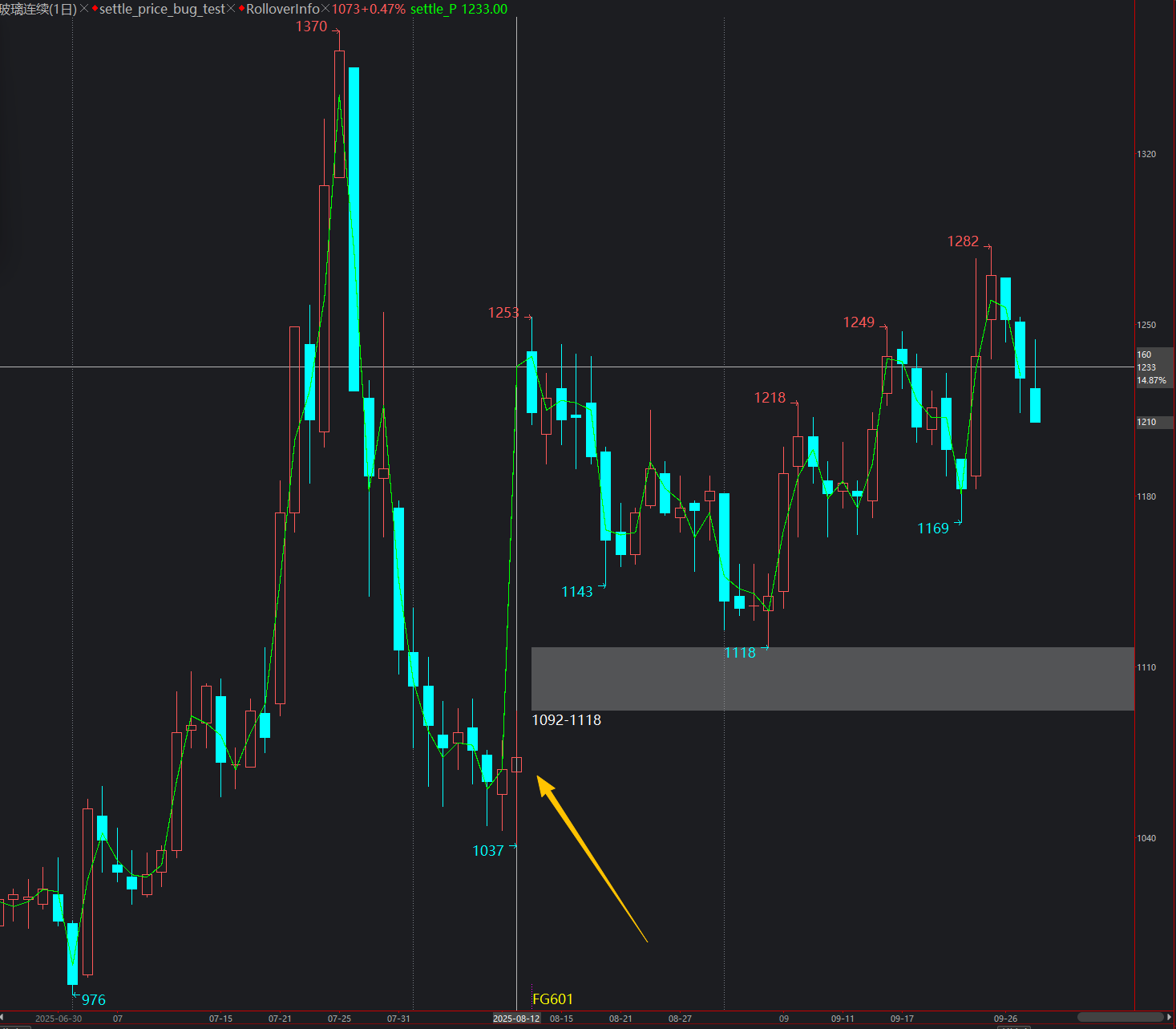 PlotNumeric("settle_P", settle_P,0,Green,1); //回溯一位,数据定位好像对了,但是无法取到9月30的,即使基础数据已经有了
