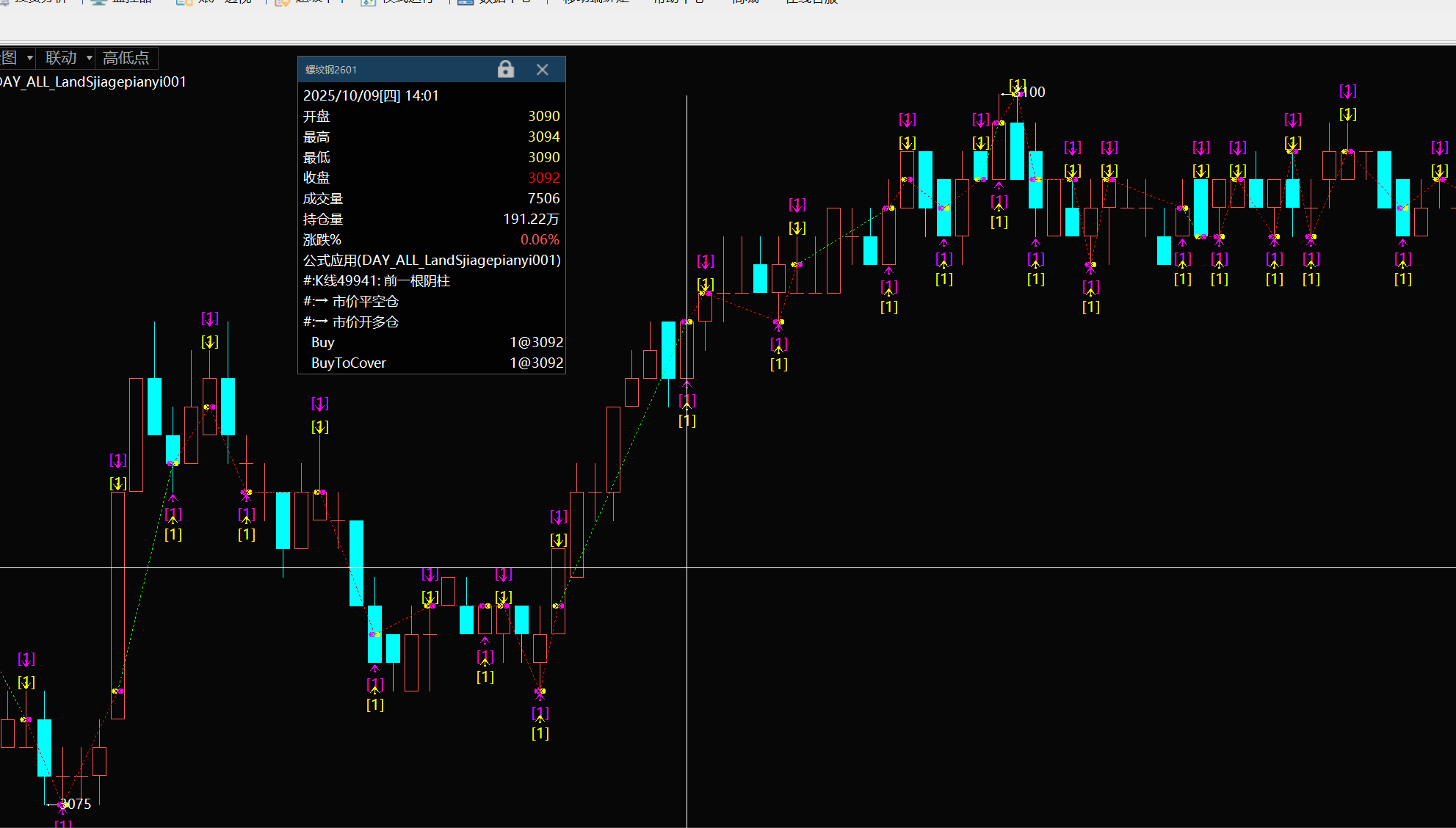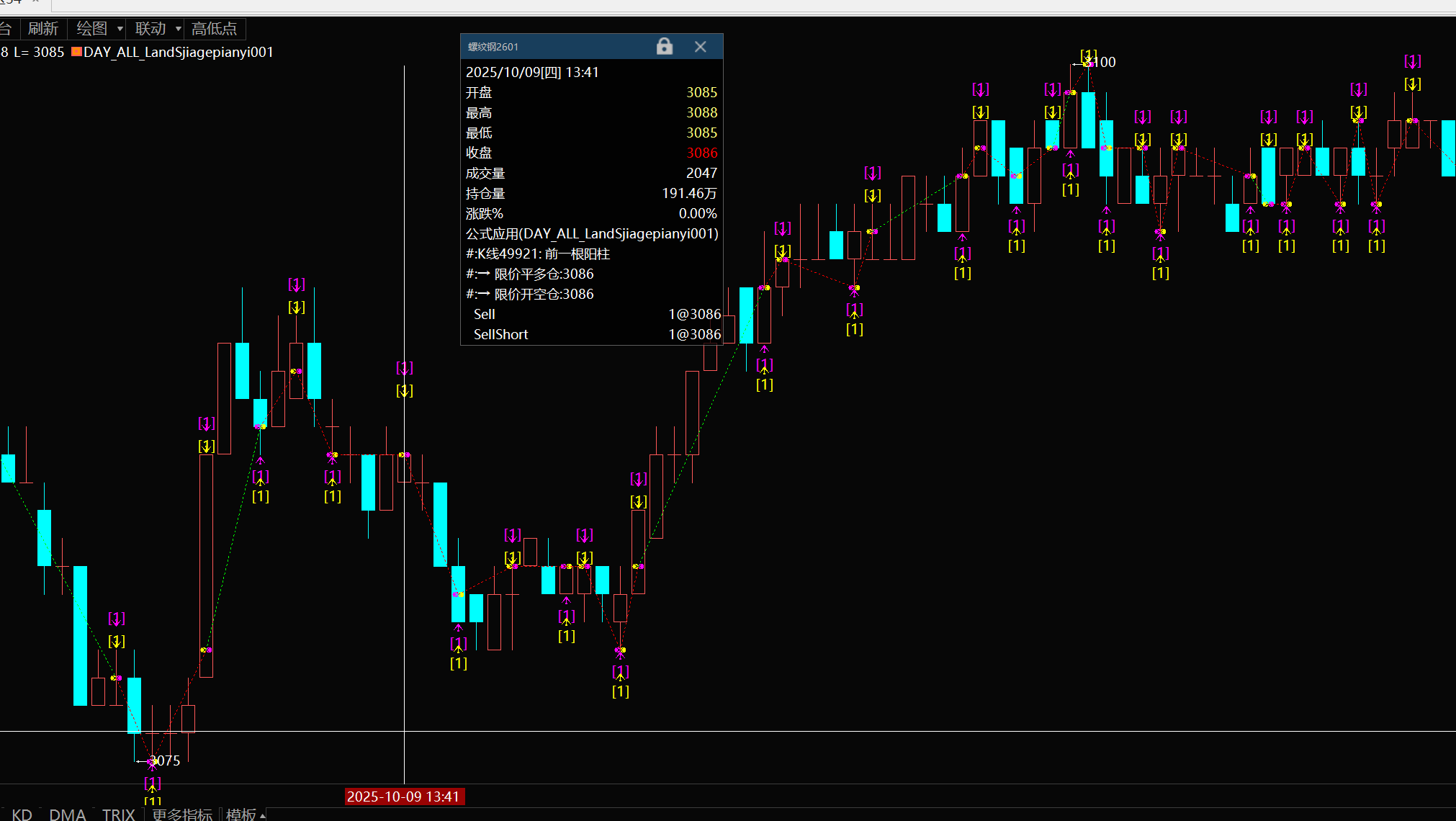 这张图十字的地方比较有代表性,前4根K线那根十字星(持仓遇到十字星不操作,但是开仓不影响),已经平空开多了,下一根K线十字星,不操作,再下一根K线是阴线,因为我是持有多单,继续持仓,直到我的标记的K线的左边那根K线,阳线,符合要求,那么就触发平多开空,所以在标记的那根K线,以开盘价+一跳,挂平多1手,挂开空1手,当根K线3085,开和平都是3086符合要求。
