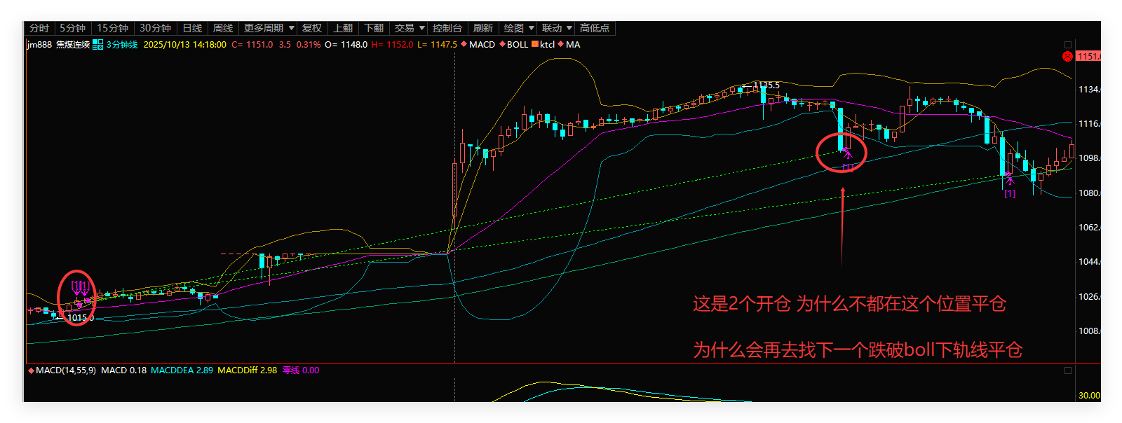 连续开仓后 就比如3分钟不同K线,以价格小于boll线的下轨线平仓,为什么不是都在第一个小于下轨线全部平仓,而是 不同的开仓要往后排下一个下轨线平仓呢