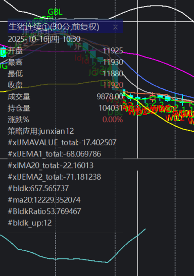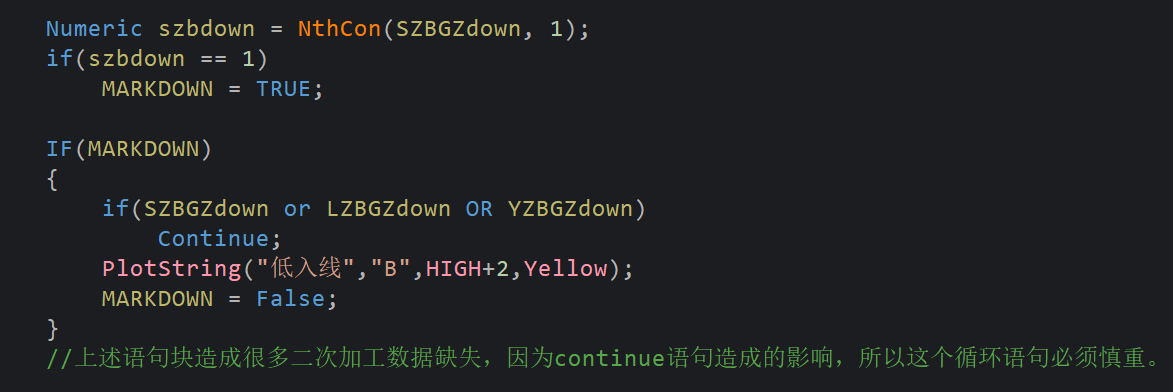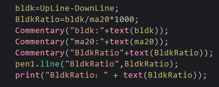 请问老师:我经常遇到对于基础数据进行二次加工过后,出现数据缺失的问题,同时也引起显示不正常的现象,例如下面实例,对于布林带带宽数据进行加工,两个指标bldk和bldkratio,然后在副图画图,图2光标线处commertary数据就无显示了,图3光标线处是正常显示的情况,可见,数据缺失了,附图后面一段的趋势线也缺失了,对print呈现的结果数据查找也发现是数据缺失了。但是,图中布林带是正常显示的,说明布林带的基础数据是正常存在的。