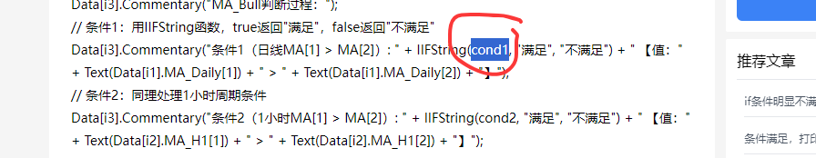 Data[i3].Commentary("条件1(日线MA[1] > MA[2]): " + IIFString(cond1, "满足", "不满足") + " 【值:" + Text(Data[i1].MA_Daily[1]) + " > " + Text(Data[i1].MA_Daily[2]) + "】");