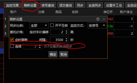 除了间隔一定时间(秒)刷新外,恳请TB3添加头寸监控的定时同步功能。如图,另外增加一个收盘前1分钟的定时刷新同步功能:如:定时刷新 14:59 。拜谢了!!!