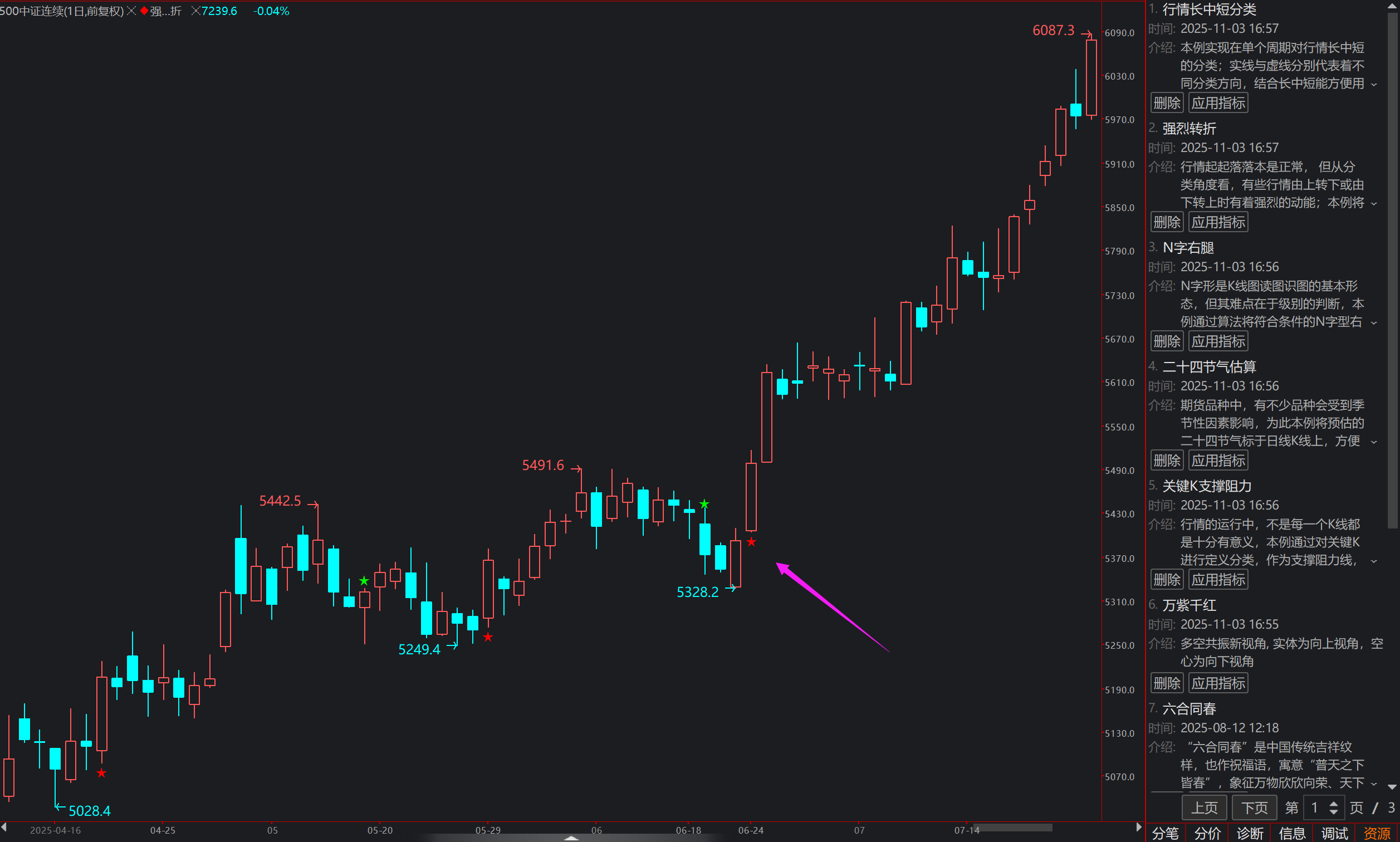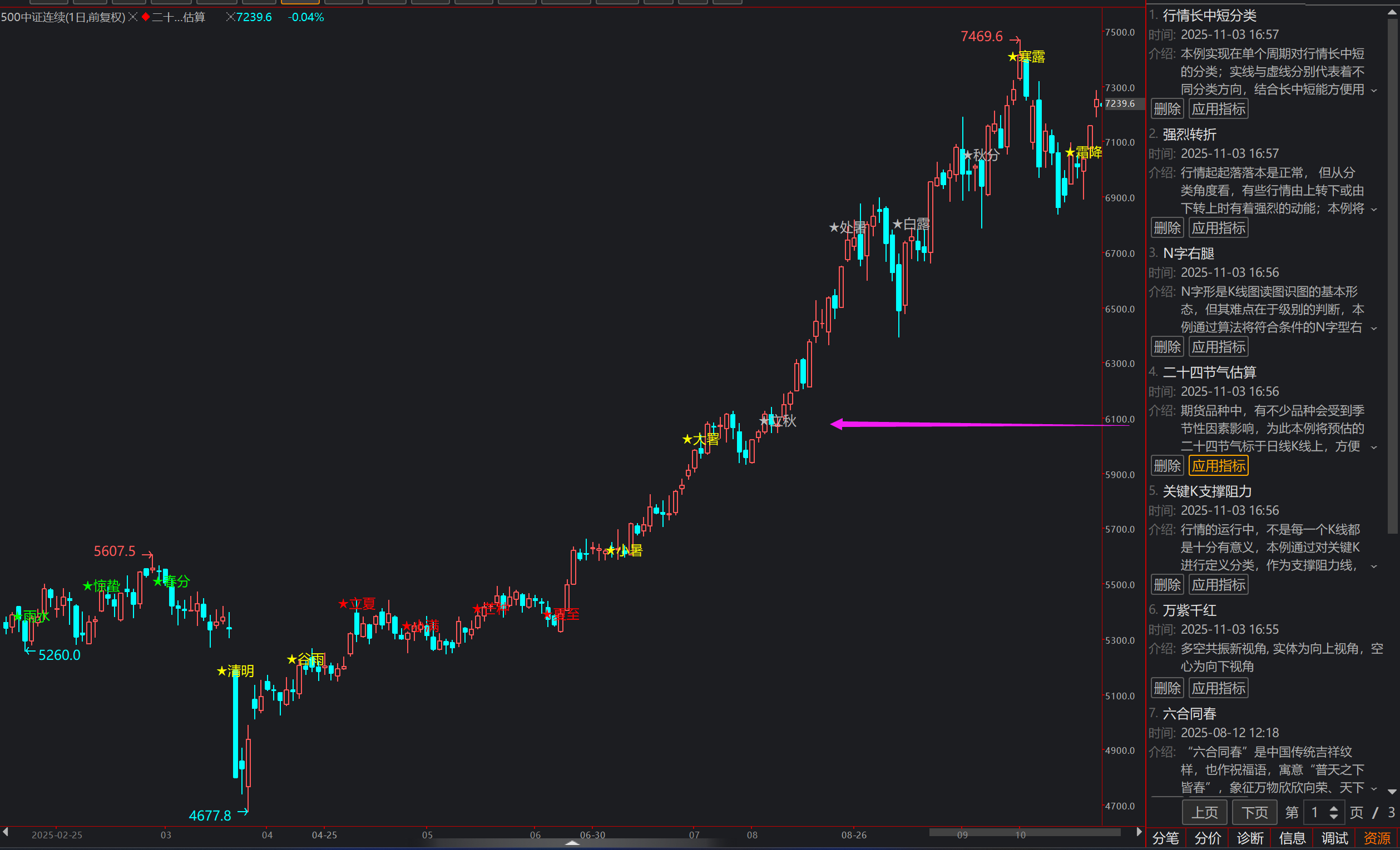 期货品种中,有不少品种会受到季节性因素影响,为此本例将预估的二十四节气标于日线K线上,方便用户对品种性质进行分类与分析。注:当前节气标注仅在日线上起作用,且具体日期与万年历上并非完全一致,大体可能会有1~2天的误差,但用作粗略分析尚可。