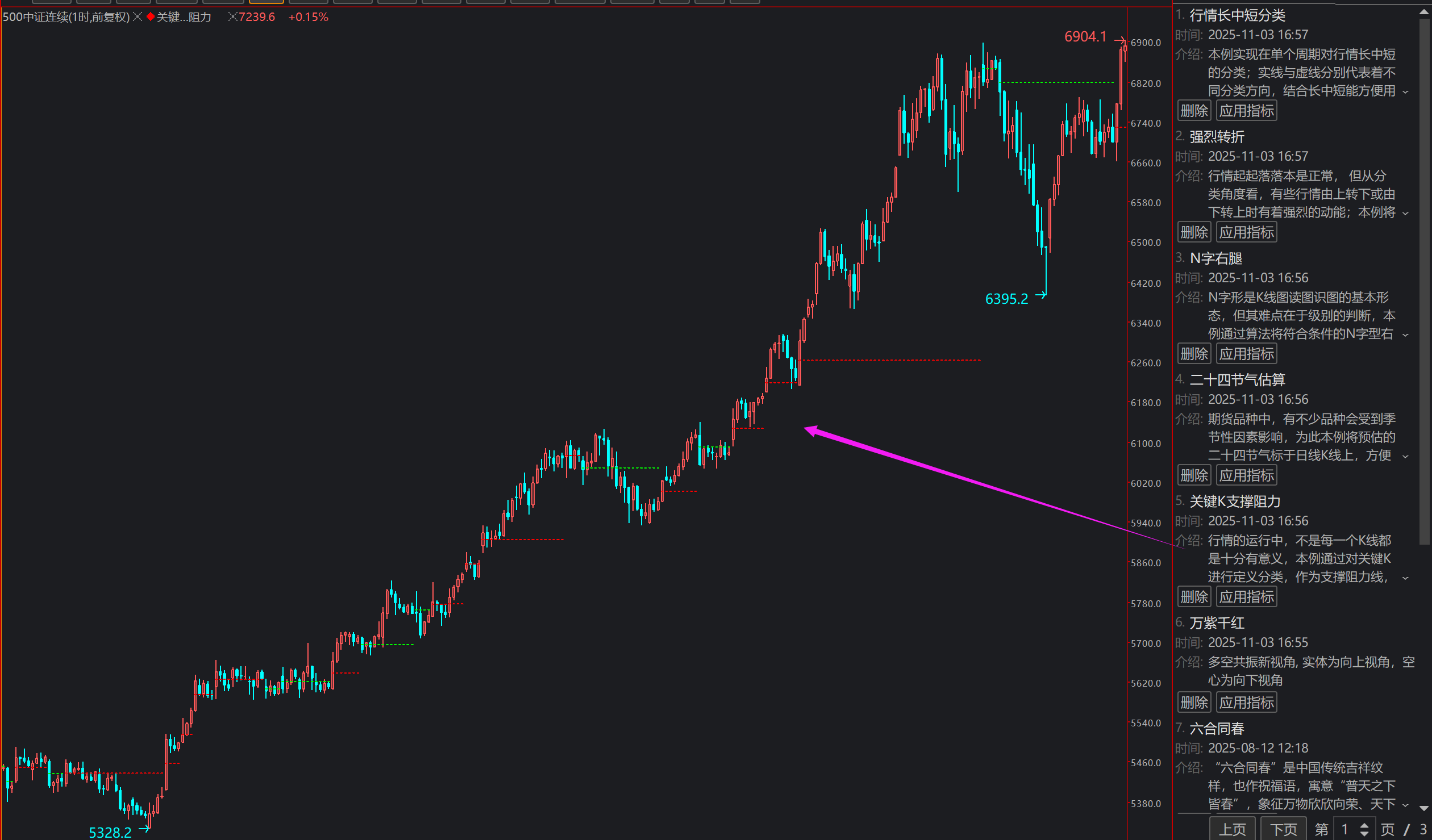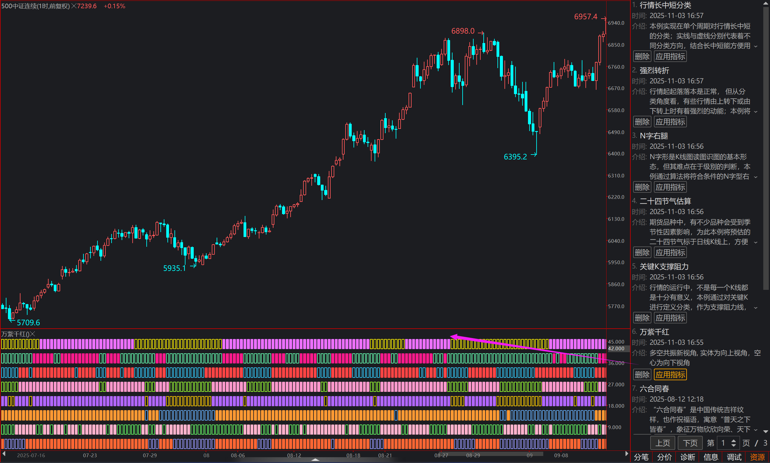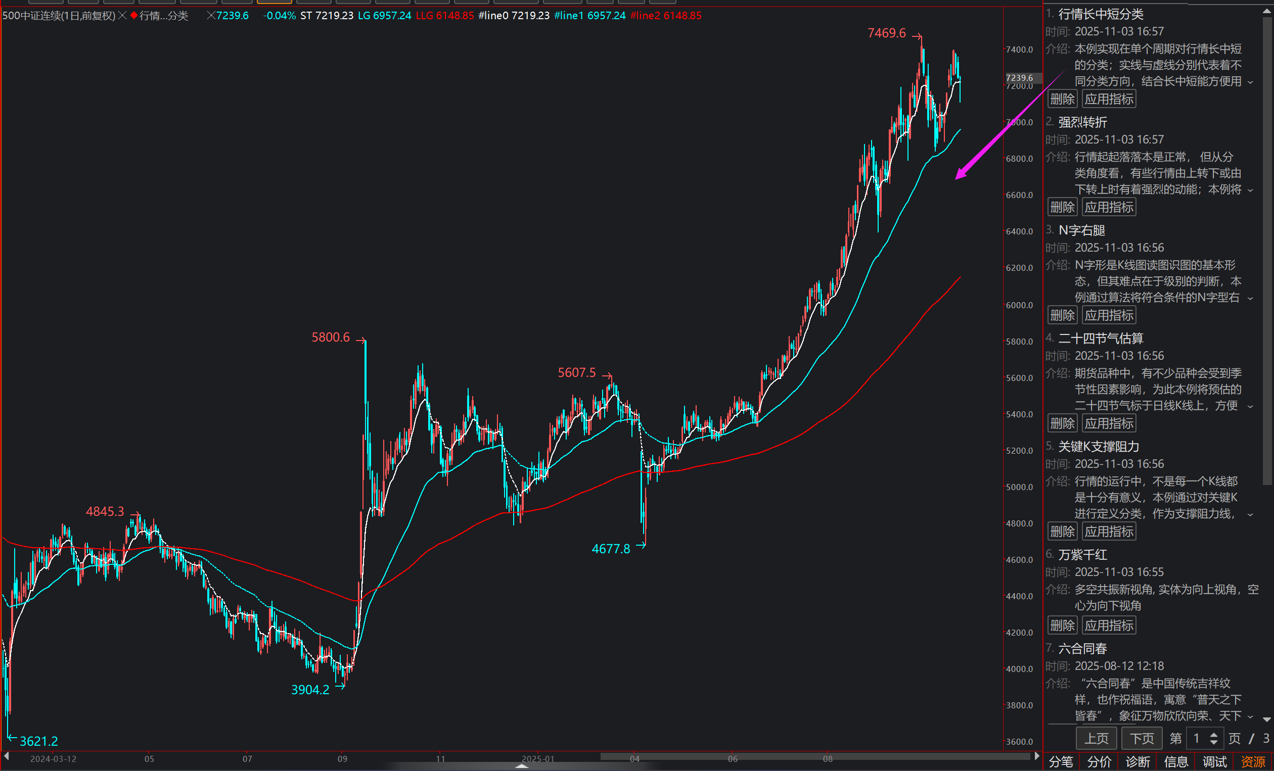 本例实现在单个周期对行情长中短的分类;实线与虚线分别代表着不同分类方向,结合长中短能方便用户对波段的观察与理解;