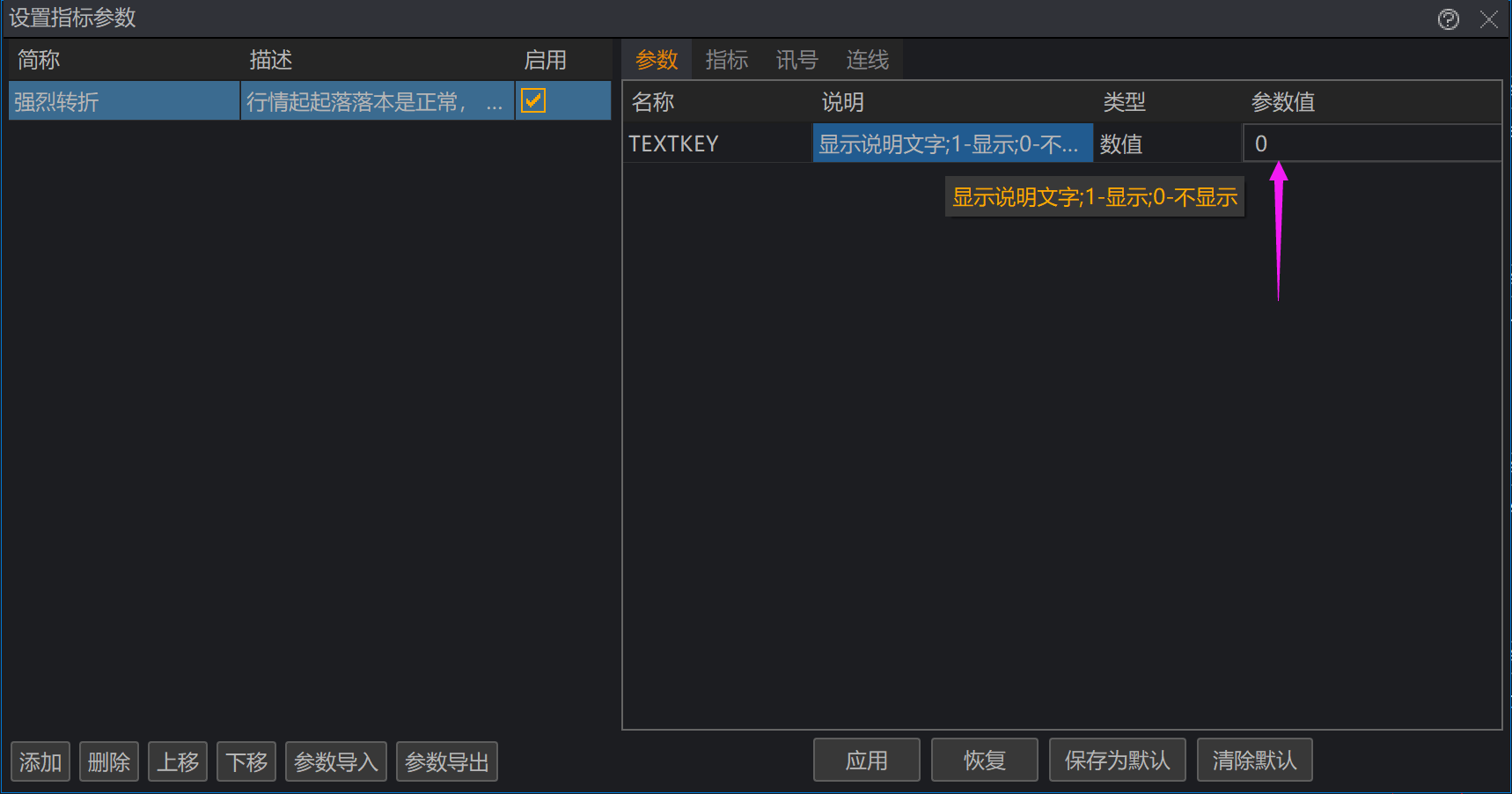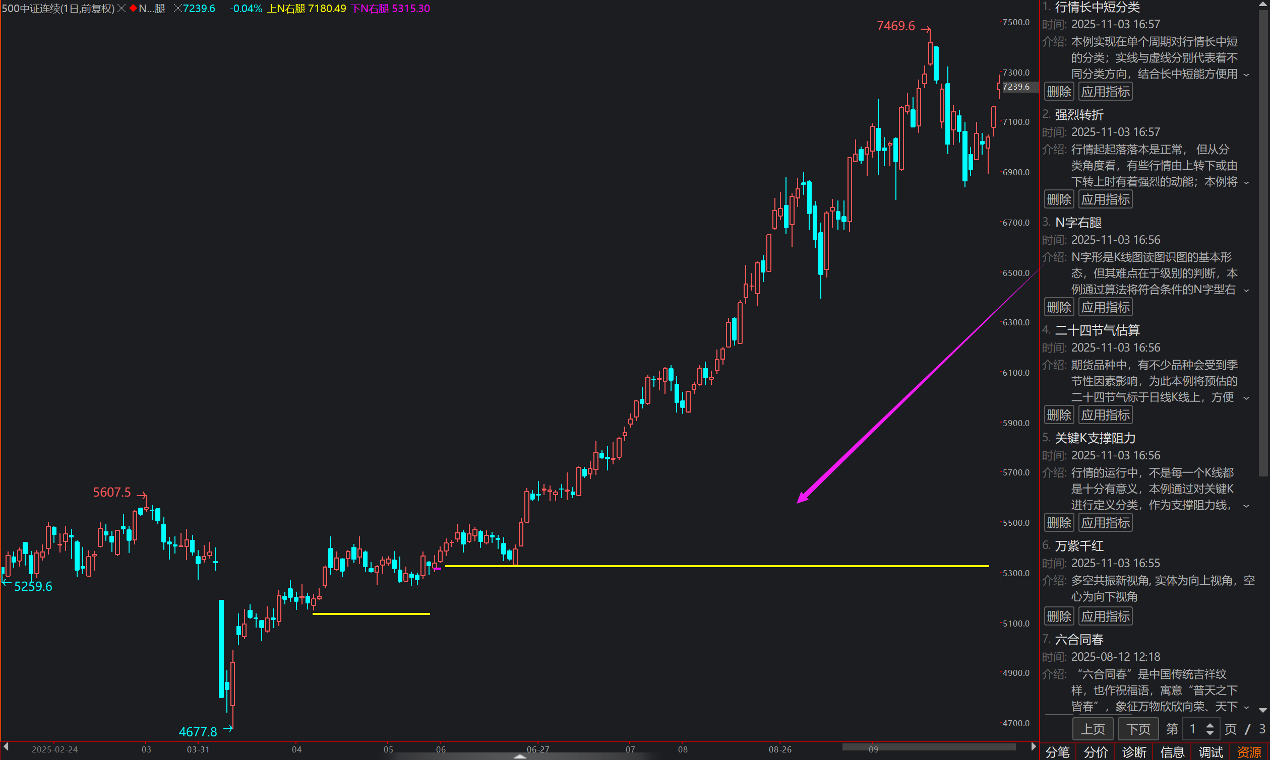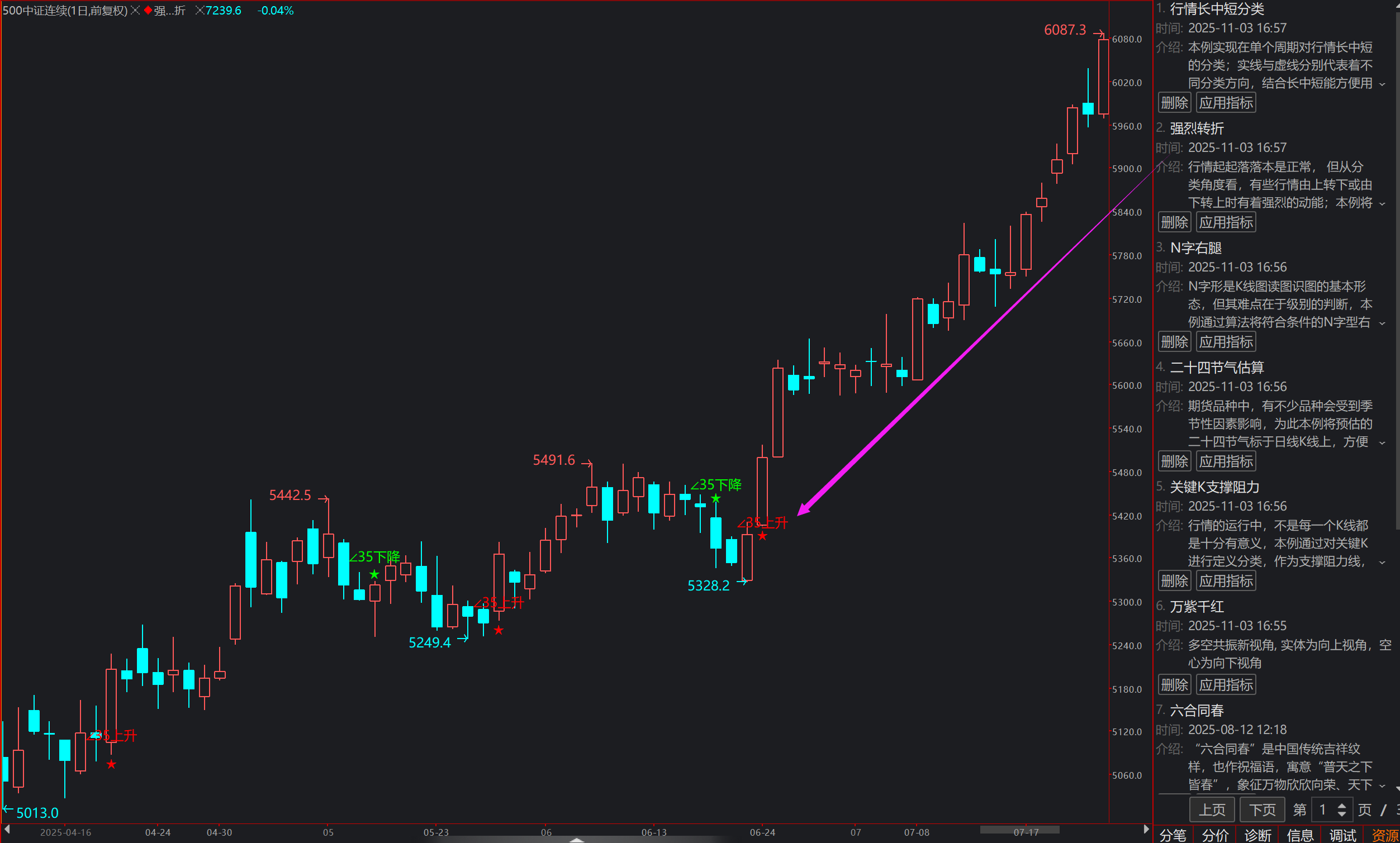 本例实现在单个周期对行情长中短的分类;实线与虚线分别代表着不同分类方向,结合长中短能方便用户对波段的观察与理解;