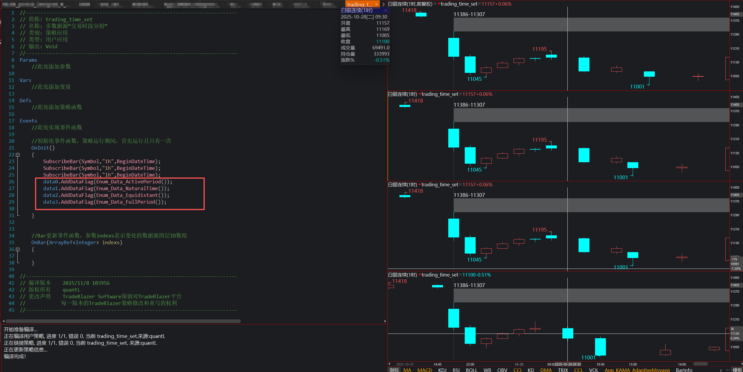 在代码中订阅了叠加数据源,比如data0是1分钟,data1是5分钟。策略单元设置中只能设置data0的交易时段分割方式,比如data0选择“完全交易时段”,但data1的设置是灰色的(默认自然时间),无法设置交易时段分割方式。