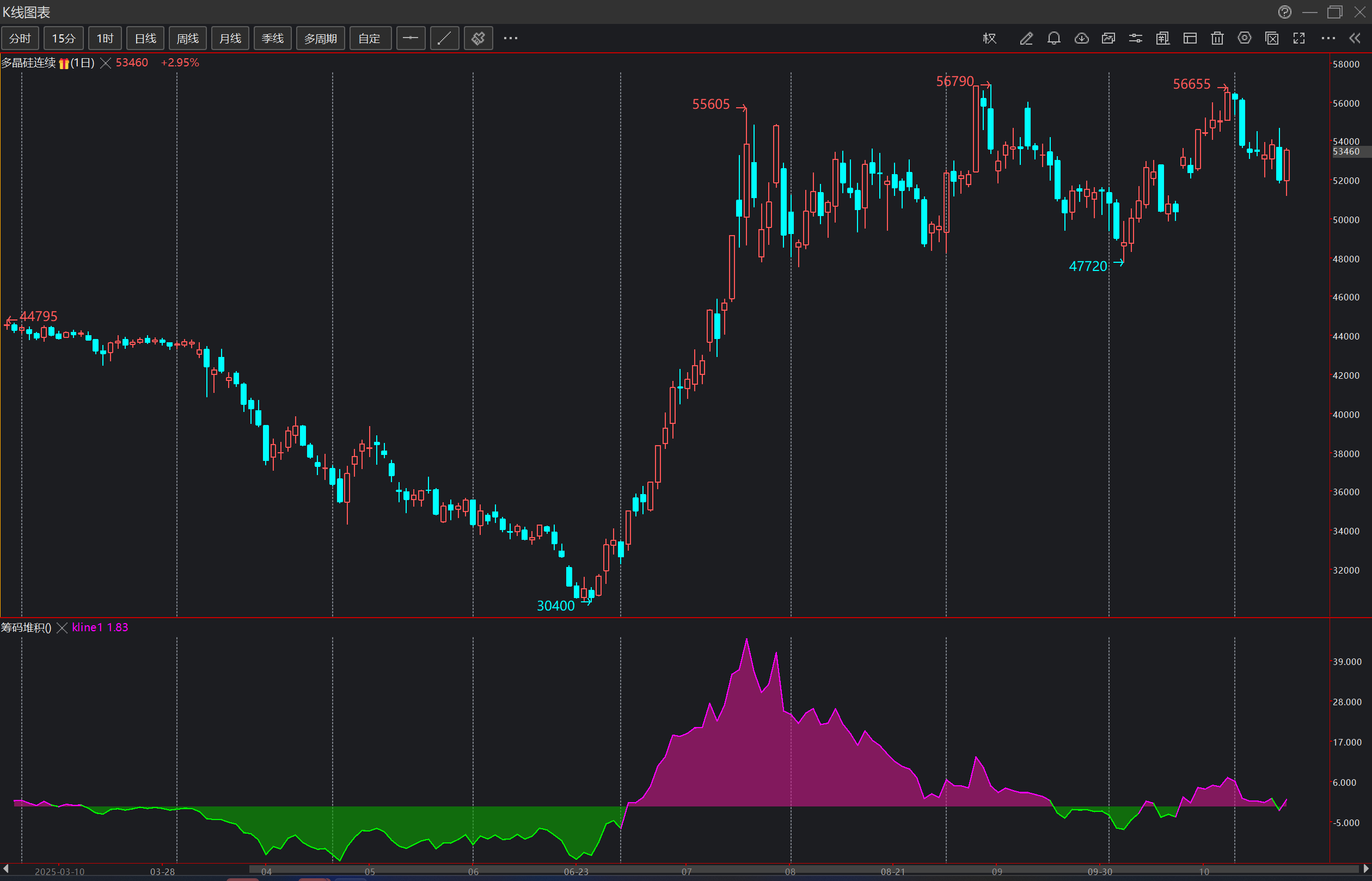 筹码经常作为识别与分类行情的有效方法;本例通过算法对筹码的堆积进行累计处理并展示,方便使用者更快识别筹码博弈的情况。