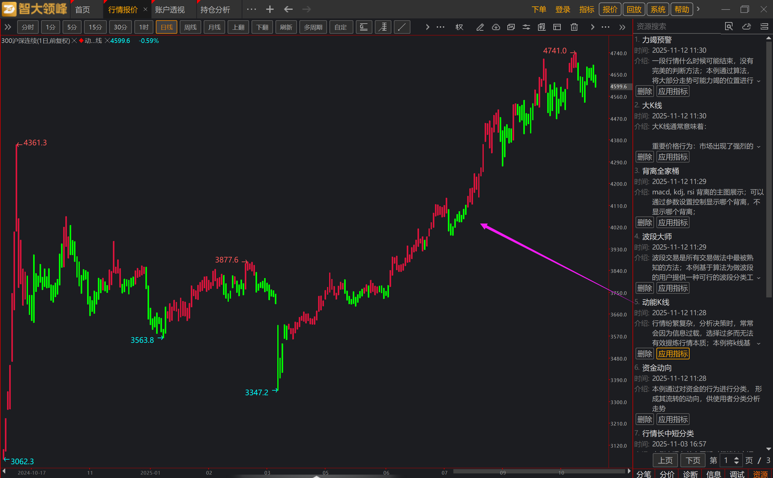一段行情什么时候可能结束,没有完美的判断方法;本例通过算法,将大部分走势可能力竭的位置进行标注;需要注意的是,不是力竭就一定会转势,其仍然存在休息一下继续延续的可能;同时还需注意,不是每段所谓的行情都有力竭的概念,请使用时结合走势结构,其他指标综合判断。