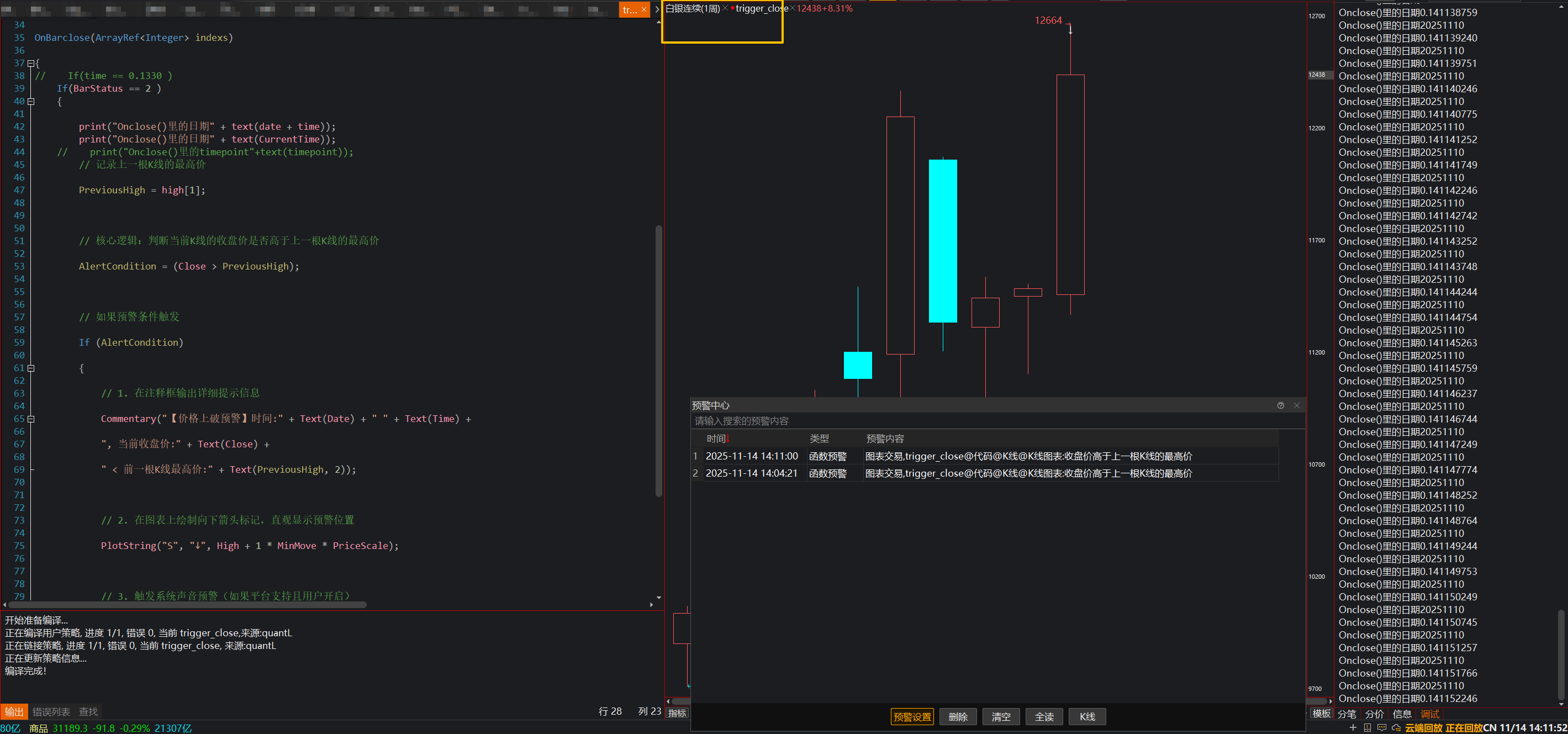 你的预警语句我没删 ,ag有预警,fg没有预警,因为不满足你设定的条件,但都是触发了Onbarclose域打印出了时间的