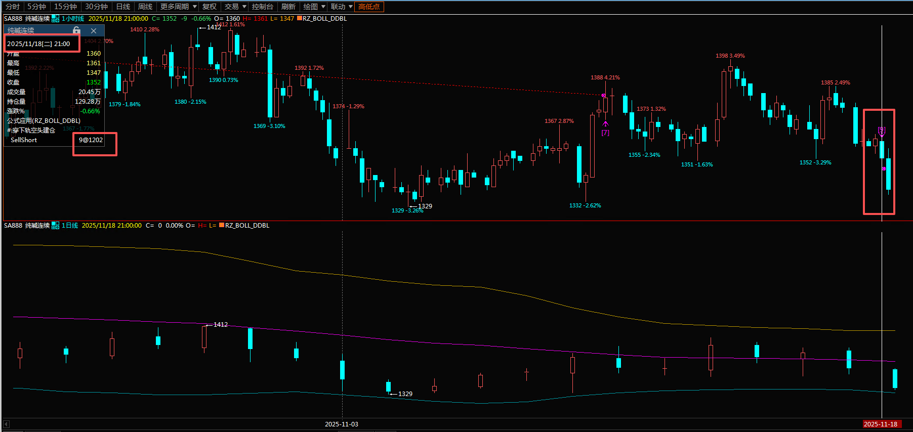 在1小时周期里通过判断1天周期中符合开仓条件进行开仓操作。