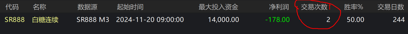 测试了下把buy后面的手数改为1,交易次数就上去了,达到了189. 之前这个交易次数最差时显示2笔,有一次显示20多笔.手数改为1后就显示189笔了,好像正常了.