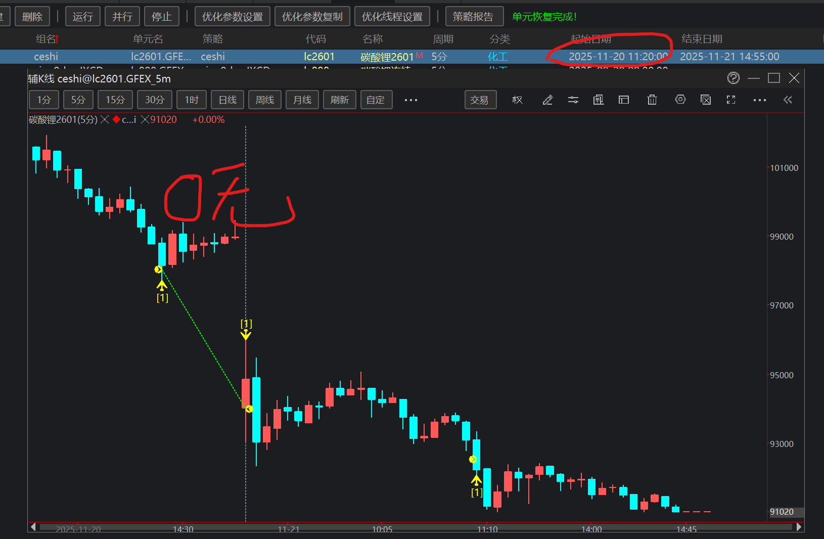 碳酸锂主力实盘时1120日14:23分满足买多条件成交1手,14:30图表显示满足K2的平仓条件(实际并未满足)如图1标识,