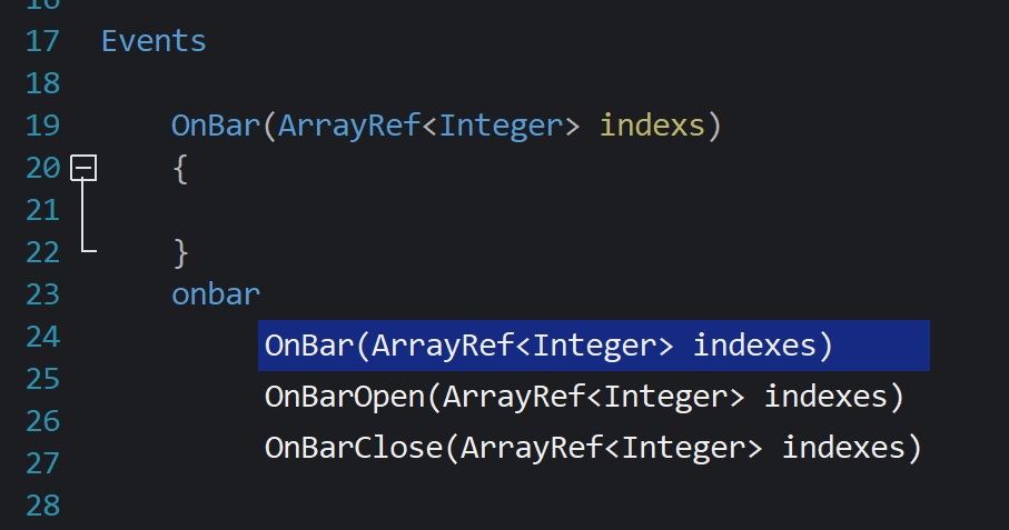 如果在策略中自己键盘敲入onbar、onbarclose或onbaropen,后面代码补全的是:
