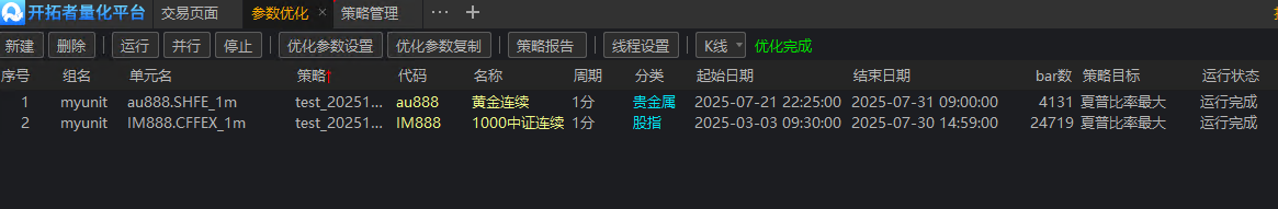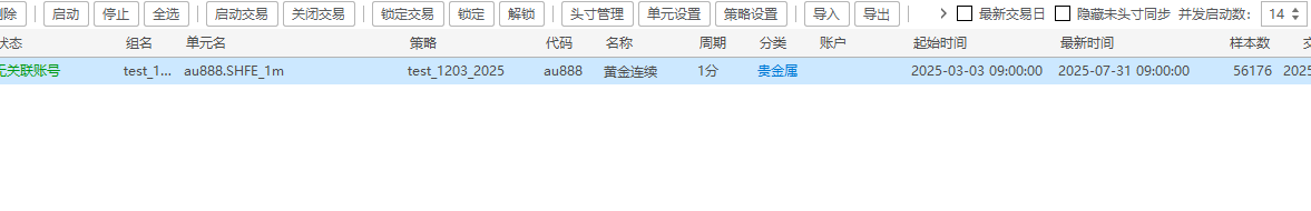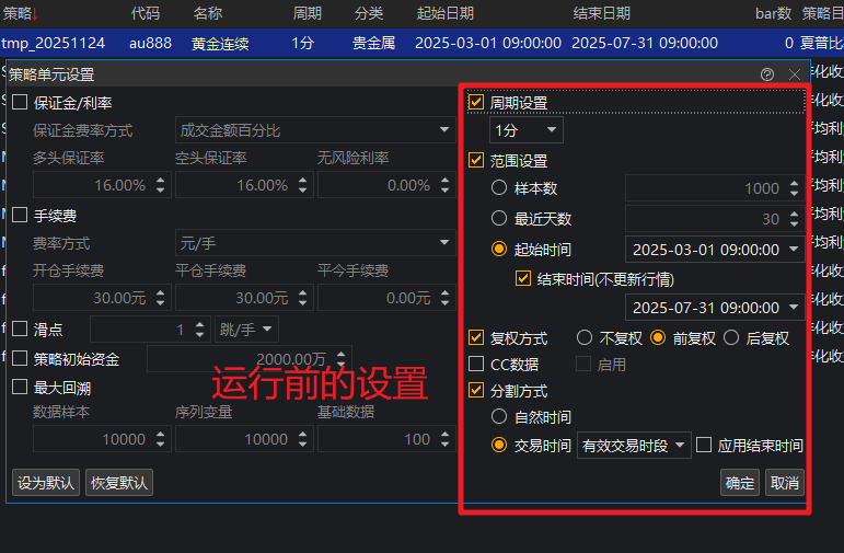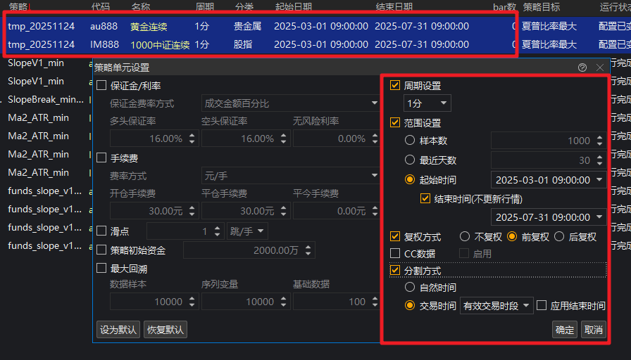 在进行回测的策略单元设置中,我把时间范围设置成:2025-03-01 ~ 2025-07-31,周期定为1分钟。