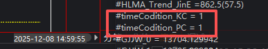 这两个图分别是在交易模式的K线图上 和 行情报价K线图上,14:59:55时的timeCodition_PC的值。同样的程序和参数,时间判断的在这两个界面结果也不一样。