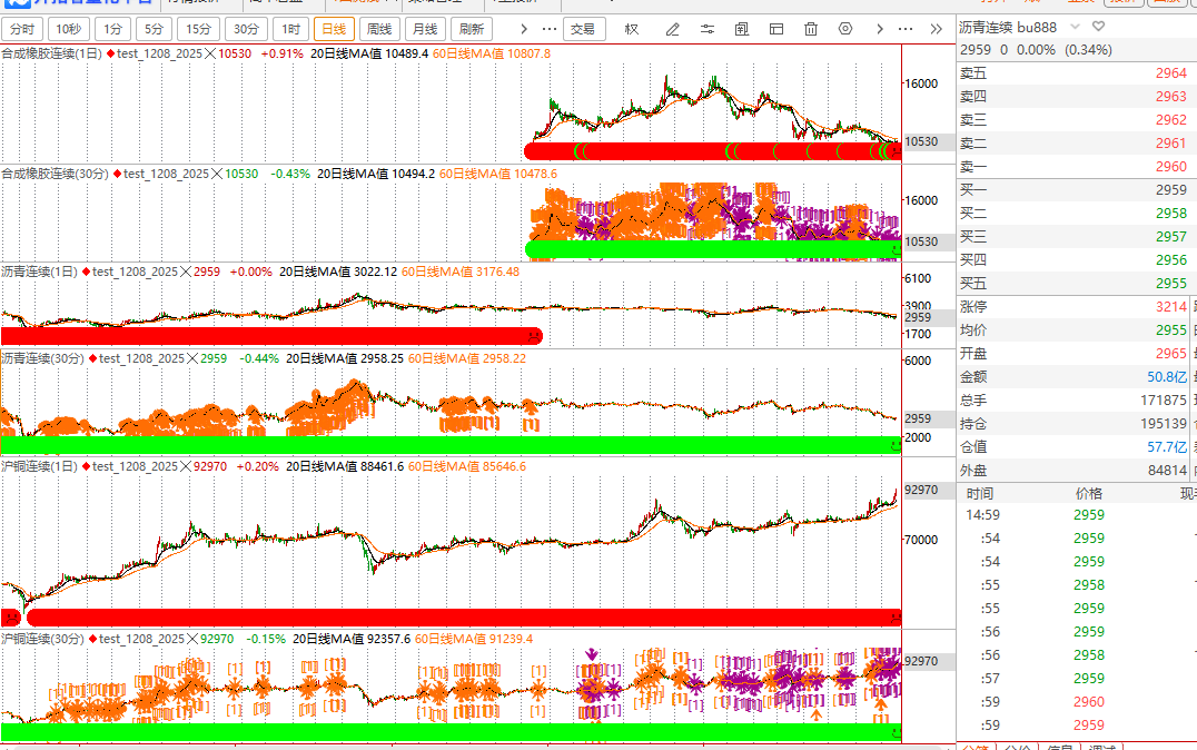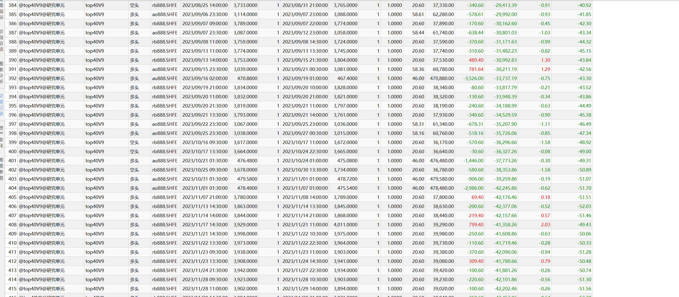 以下代码在运行时有两个问题,第一:如图一所示,回测时只有"rb888.SHFE","ao888.SHFE","au888.SHFE"这三个品种有交易记录,剩余三个品种没有交易记录。第二:如图二所示,多头的四个条件都满足时,最足条件仍然显示不满足。我调试了一周,仍然没找出原因,恳请高手帮忙看看。