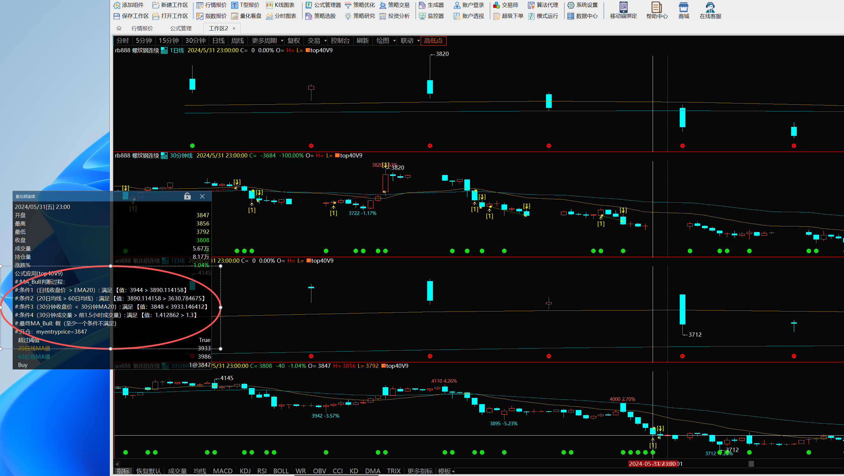 Data[i3].Commentary("条件3(30分钟收盘价 < 30分钟MA20): " + IIFString(Data[i1].cond3, "满足", "不满足") + " 【值:" + Text(Data[i3].Close[1]) + " < " + Text(Data[i3].MA_20[1]) + "】");