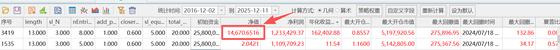如图,在选择同参数优化后,参数优化报告中同一组参数的净值,和其打开的测试报告不一致,参数优化报告中的年化收益率、夏普率的值计算也不正确。