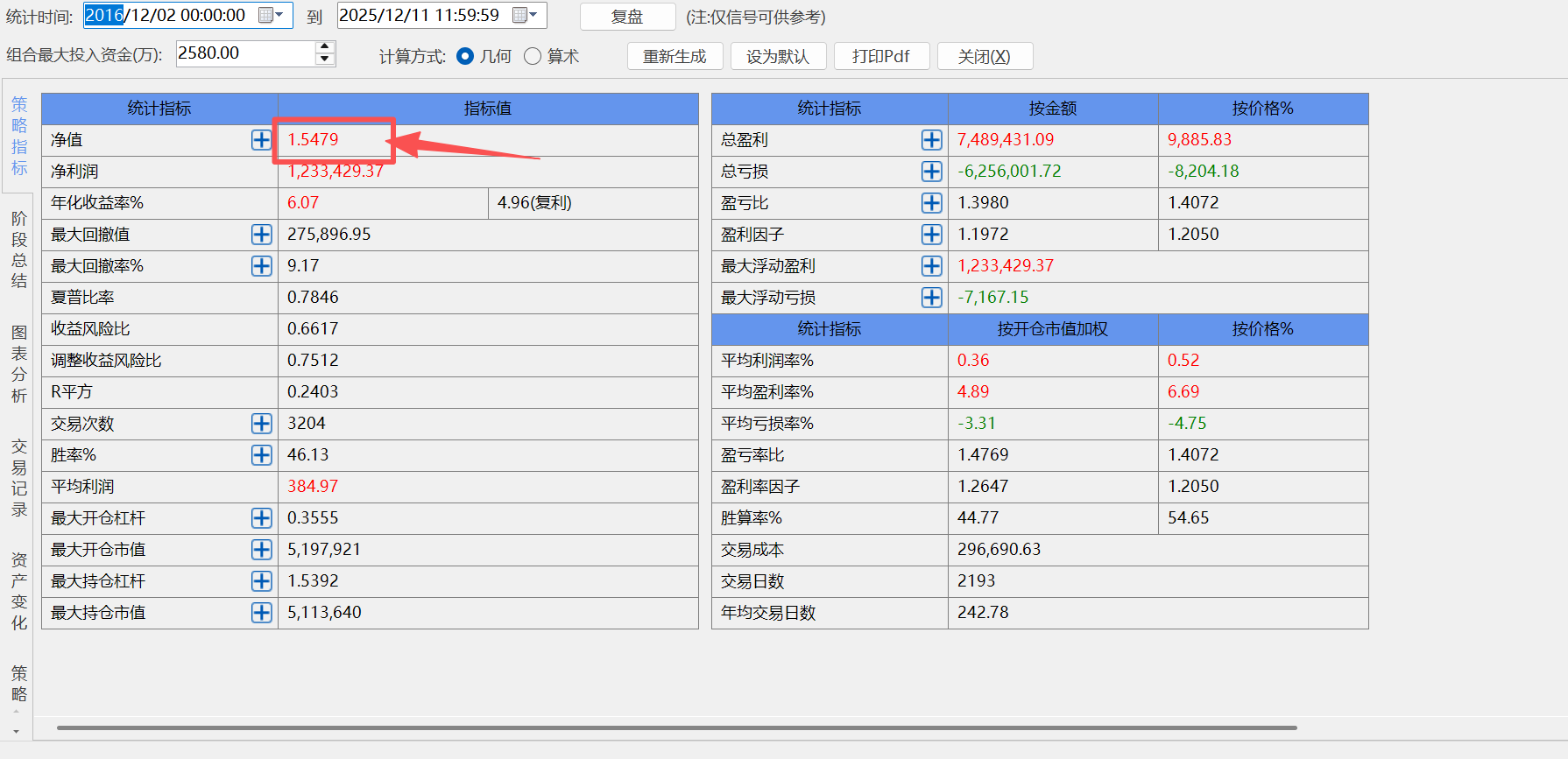 图2:该参数组合打开的测试报告中显示净值为1.54,感觉这个才是正常的。