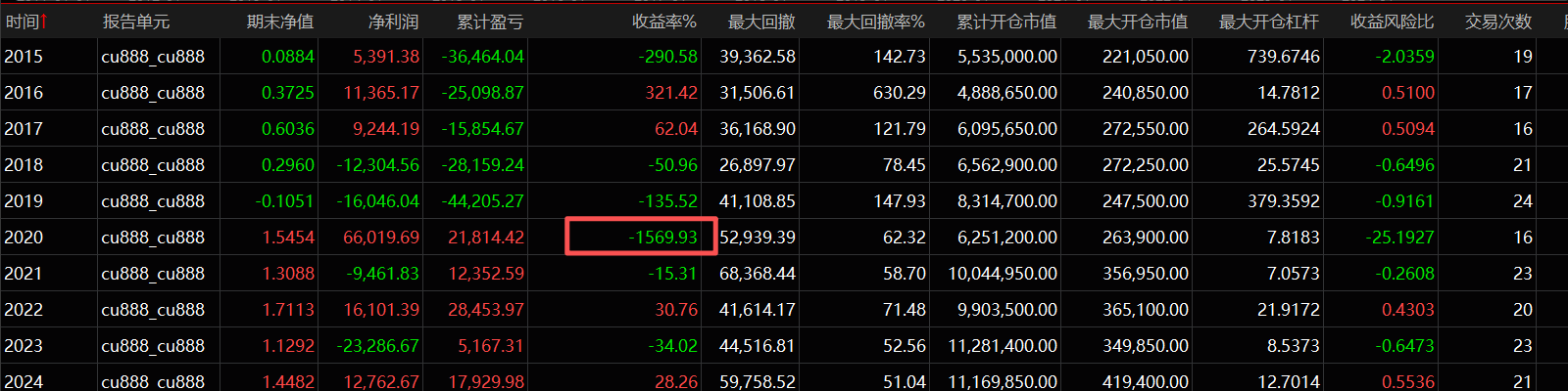 回测的铜主力连续指数。2020年收益率-1500%以上,净利润却是大增。