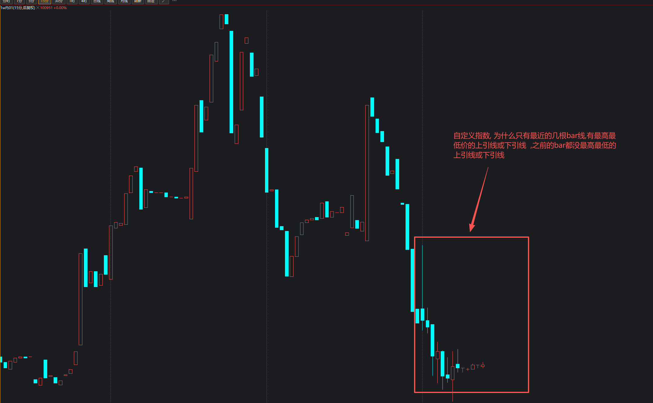 自定义指数, 为什么只有最近的几根bar线,有最高最低价的上引线或下引线 ,之前的bar都没最高最低的上引线或下引线