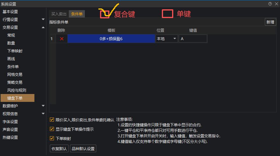 背景:目前键盘下单,在定义快捷键时只支持定义单个按键。如果想对条件单模板进行下单(用户条件单模板较多),就有点不灵活了。