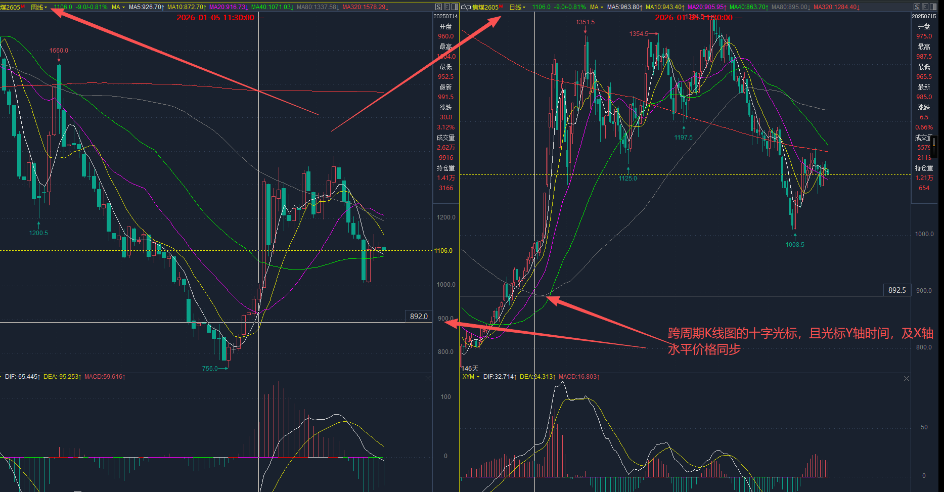 如:1小时周期十字光标定位到2026.01.05 10:00,水平价格定位到892元;那么日线周期也用十字光标定位到2026.1.5日,光标水平线定位到892元高度。