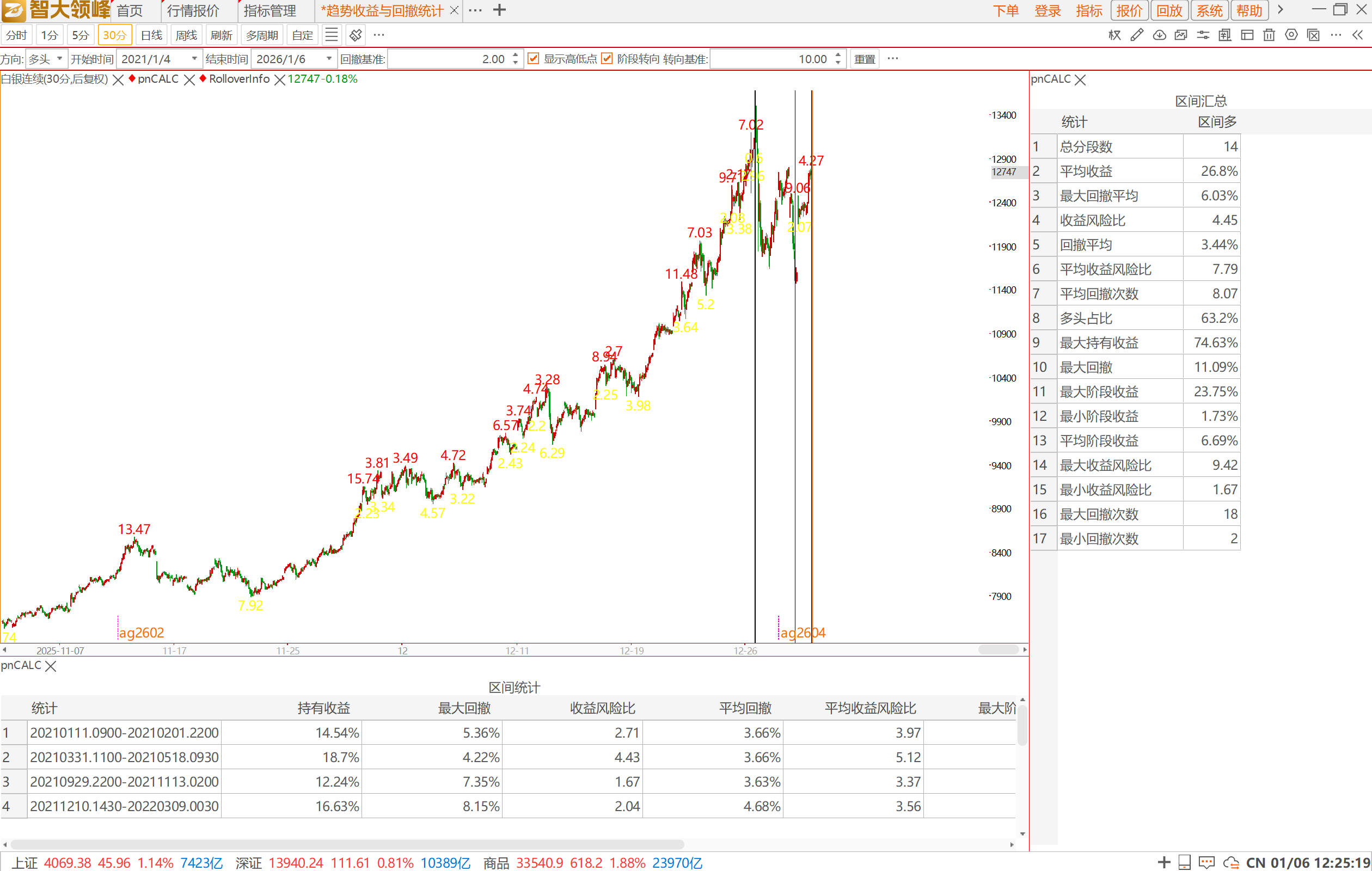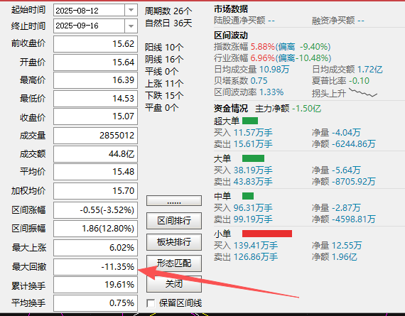 建议:根据用户在K线图中框选的统计范围,计算出区间回撤值