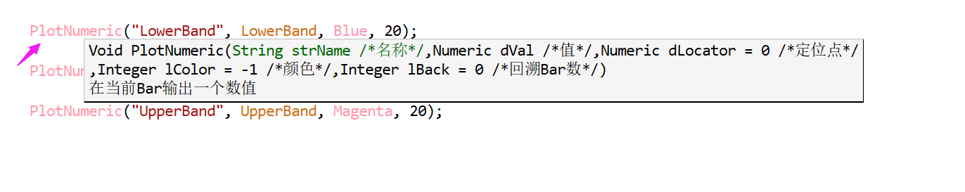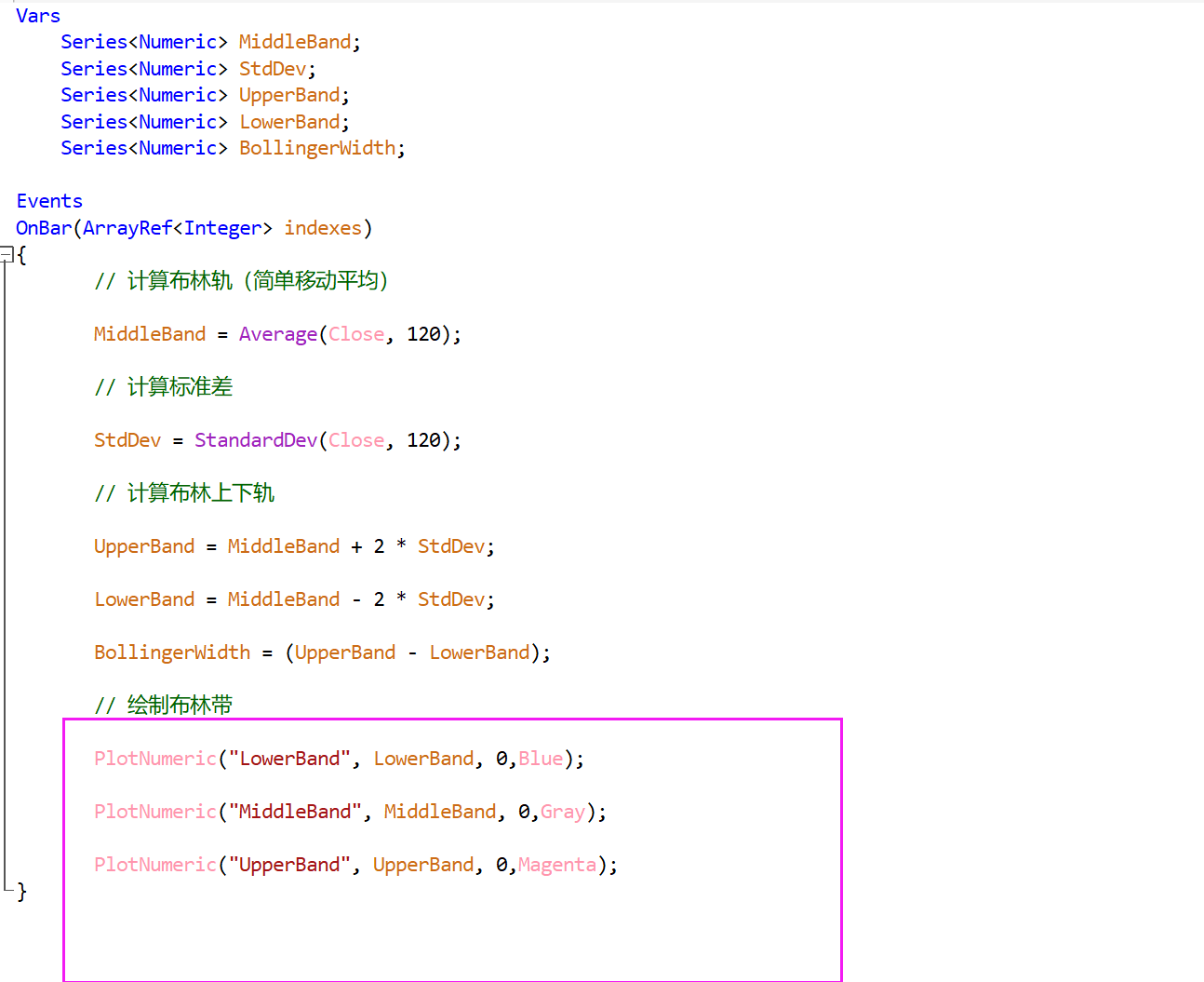 PlotNumeric("UpperBand", UpperBand, Magenta, 20);