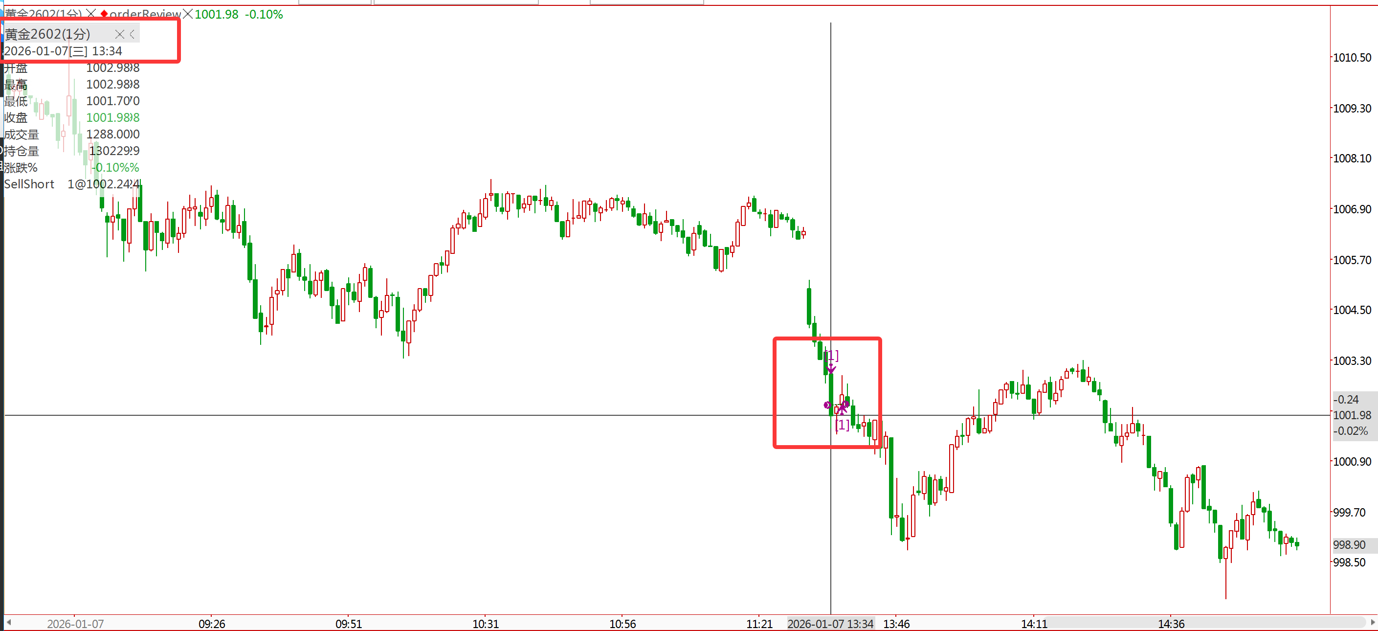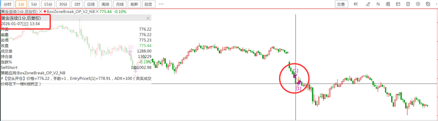 图1: 黄金回测下单时间点是下午13:34
