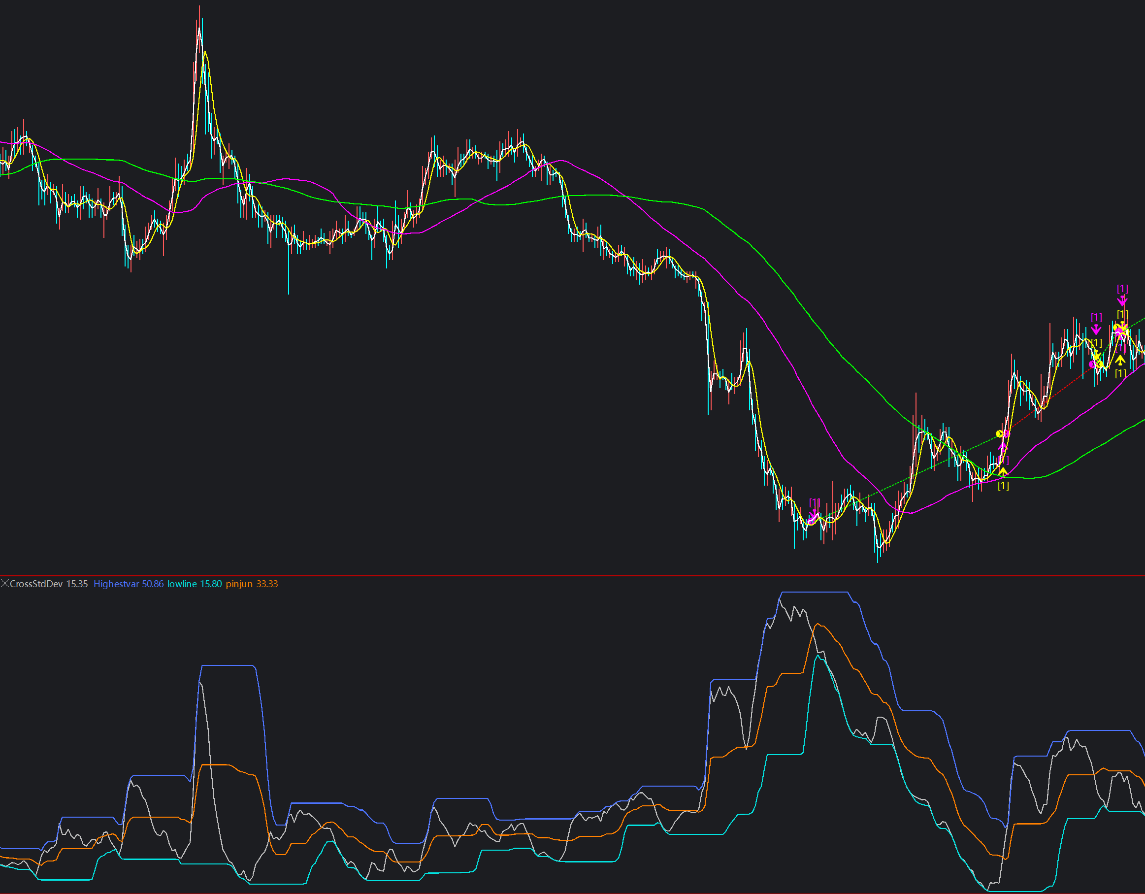 If (!AlreadySold && MarketPosition > -1 And CrossUnder(CrossStdDev , pinjun) )