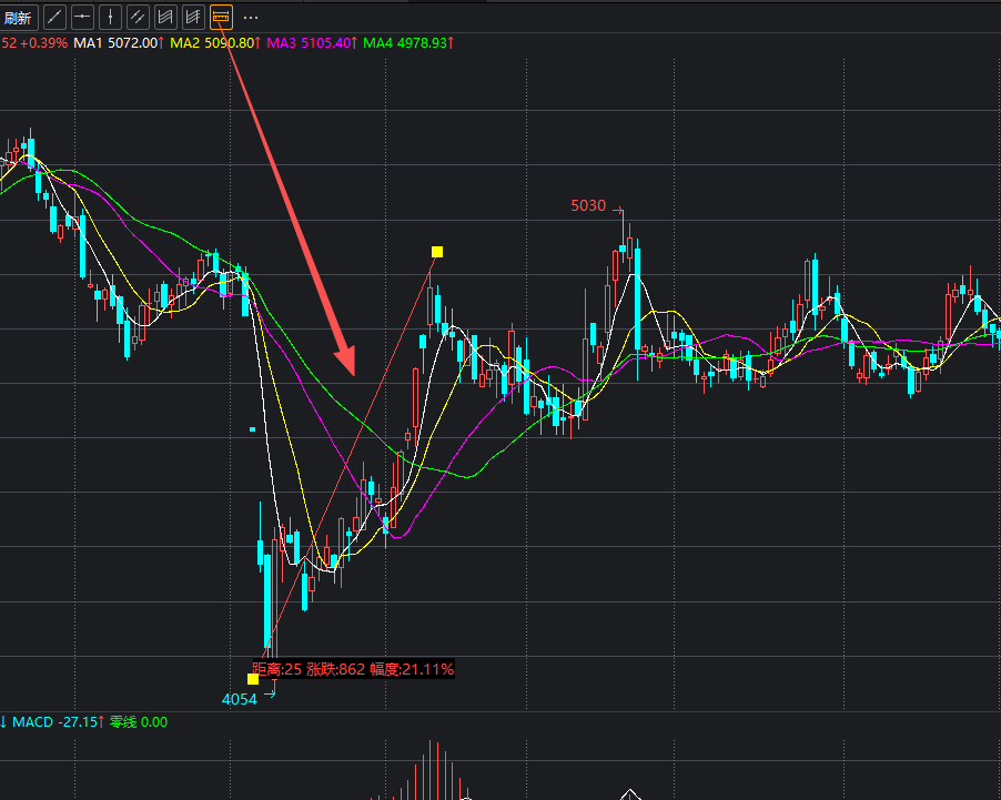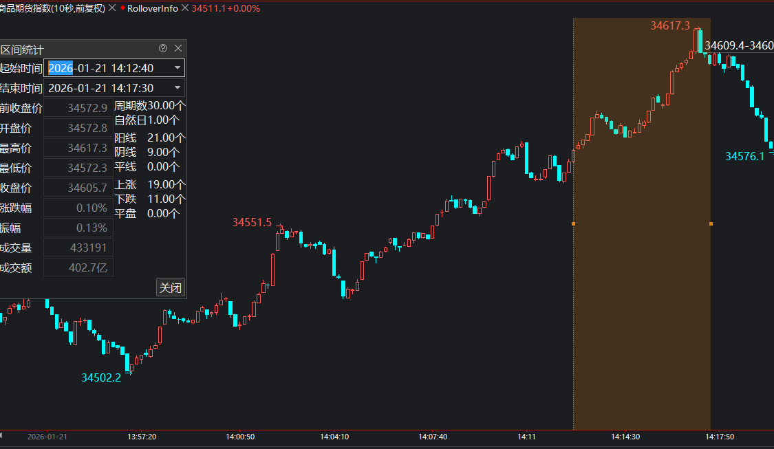 3、建议增加 一个,在K线窗口有十字光标时,按住Cltrl键不放时,运行测量功能。