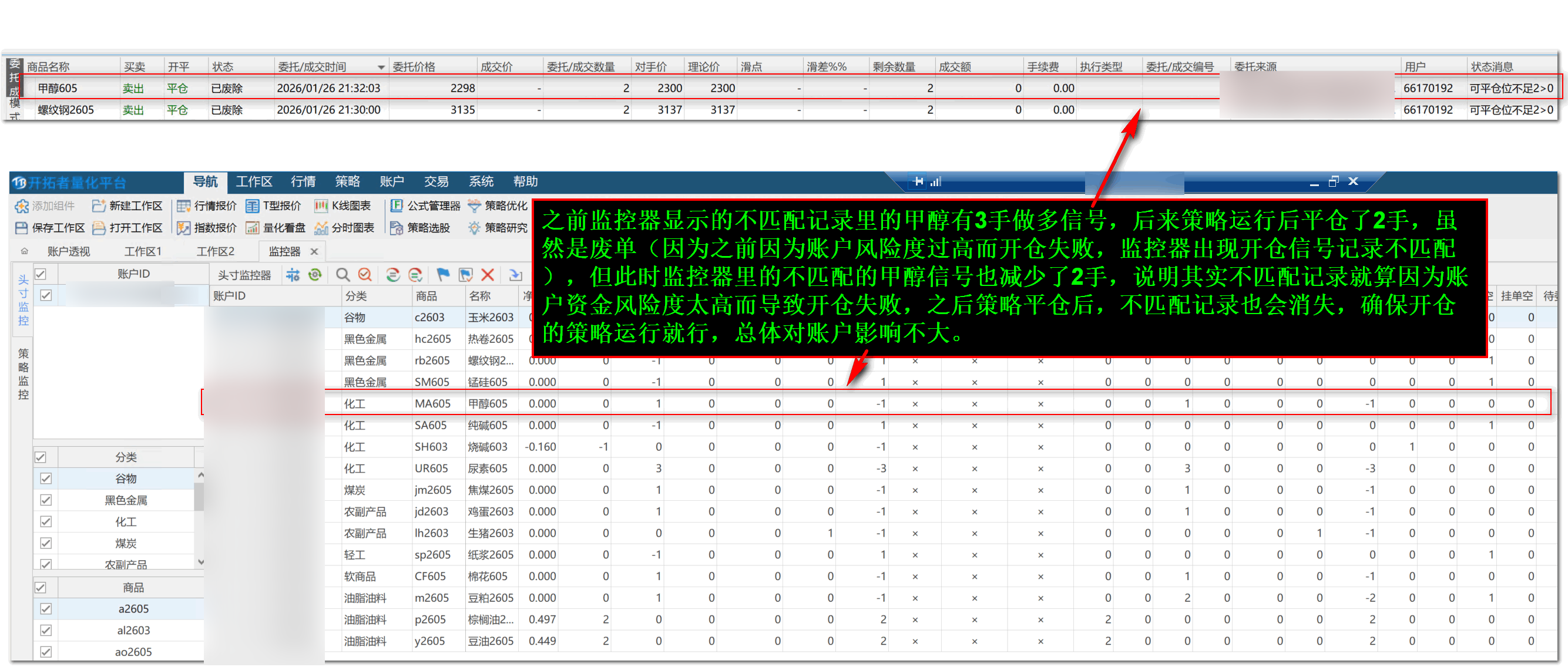 模拟账户的初始资金是2000w,我用来跑策略一段时间后,想测试策略在100w资金的情况下的表现,于是我就对模拟账户手工出金1900w,此时我加的很多策略还在不停的出现信号,但因为资金风险控制(风险度不能超过60%)的设置而开不了仓,于是监控器里出现了很多不同步的记录。但我尝试去做同步,发现也因为账户风险度太高而开不了仓就无法同步。