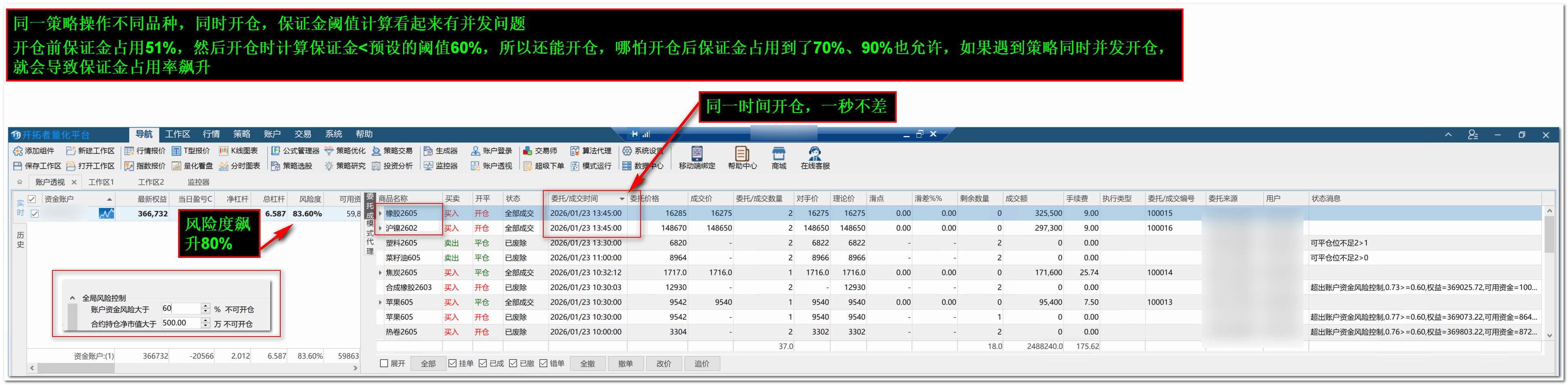 设置的账户资金风控好像失效了,可能是当策略A在时间t出现开仓信号,检查到当前保证金占用小于阈值60%,于是准备开仓,但还没开仓时,策略B也在时间t发现了开仓信号,于是也打算开仓。最后策略A和策略B同时开仓,导致账户风险度远大于预设阈值。