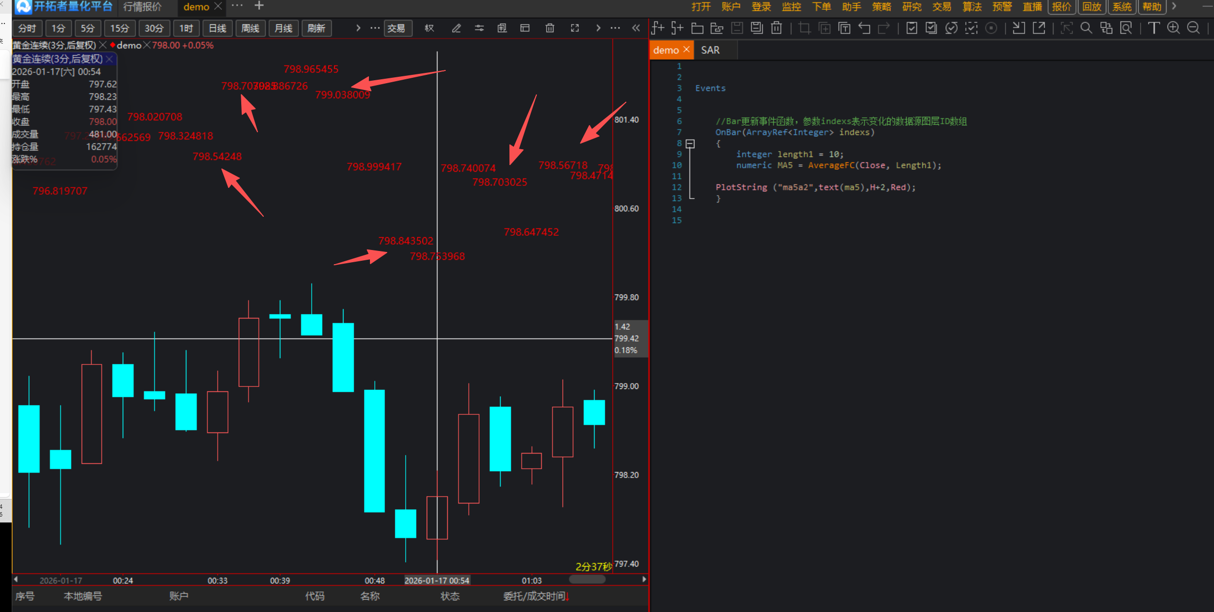 请问,上面代码中,为什么前俩条执行后,显示不出最新k线的5均线值