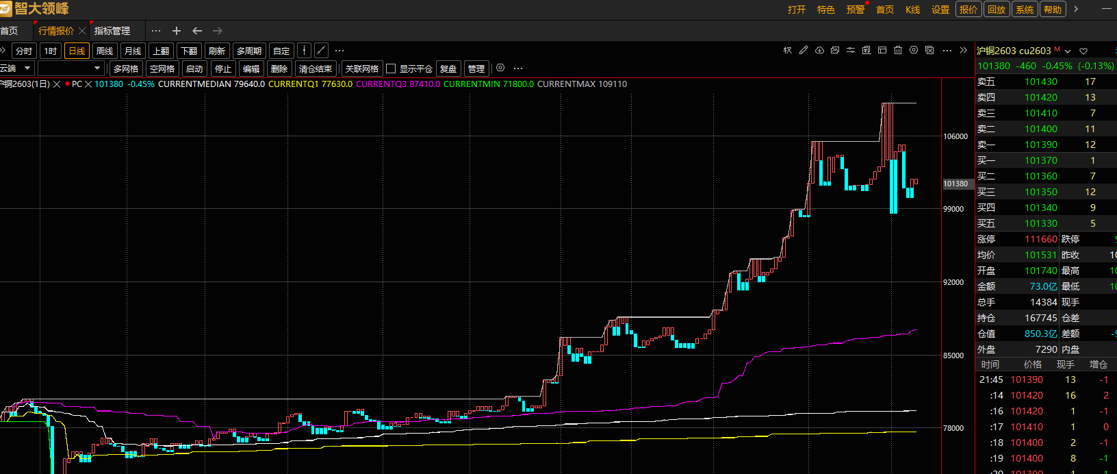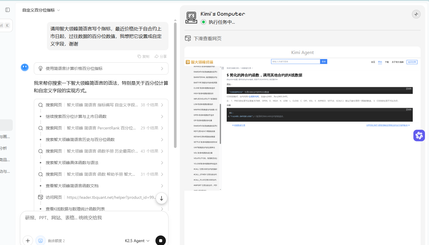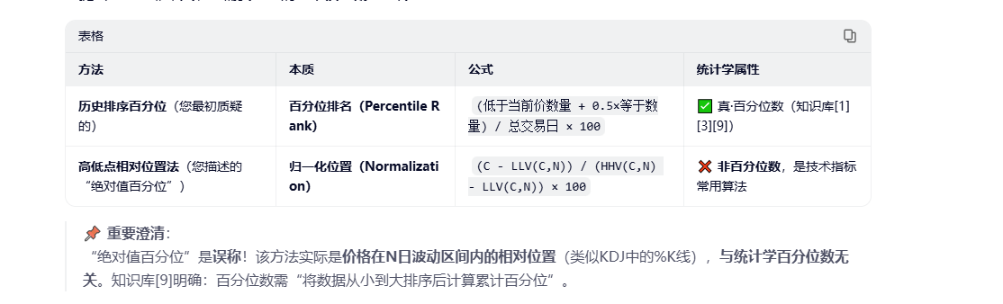 还是不会啊,这个指标只能计算出百分位25,50,75对应的数值,我想找出最新价处于历史数据的具体百分位值,如下图,我想知道cu2603,101400对应的百分位值是多少? 可以帮忙写一下吗?实在搞不懂、// 定义:计算从上市首日至当前K线的全局动态分位数