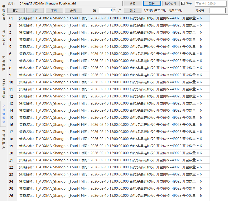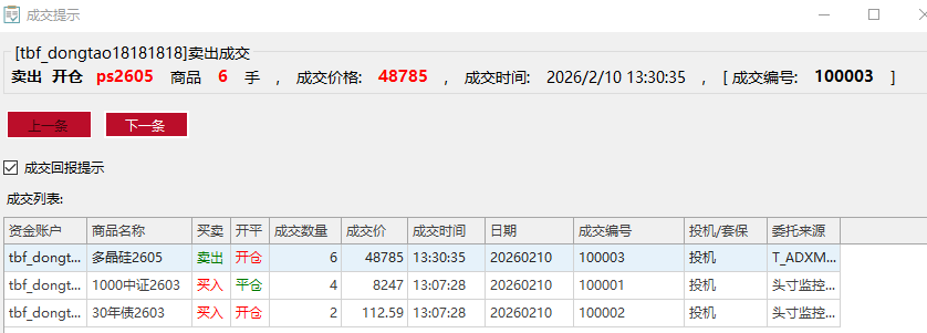 我想记录一下交易日志,模拟过程中,遇到了一个问题,60分钟策略,13:30分,触发了多晶硅2605开空6手,成交提示和账户都是只交易一笔,没有问题,入下图