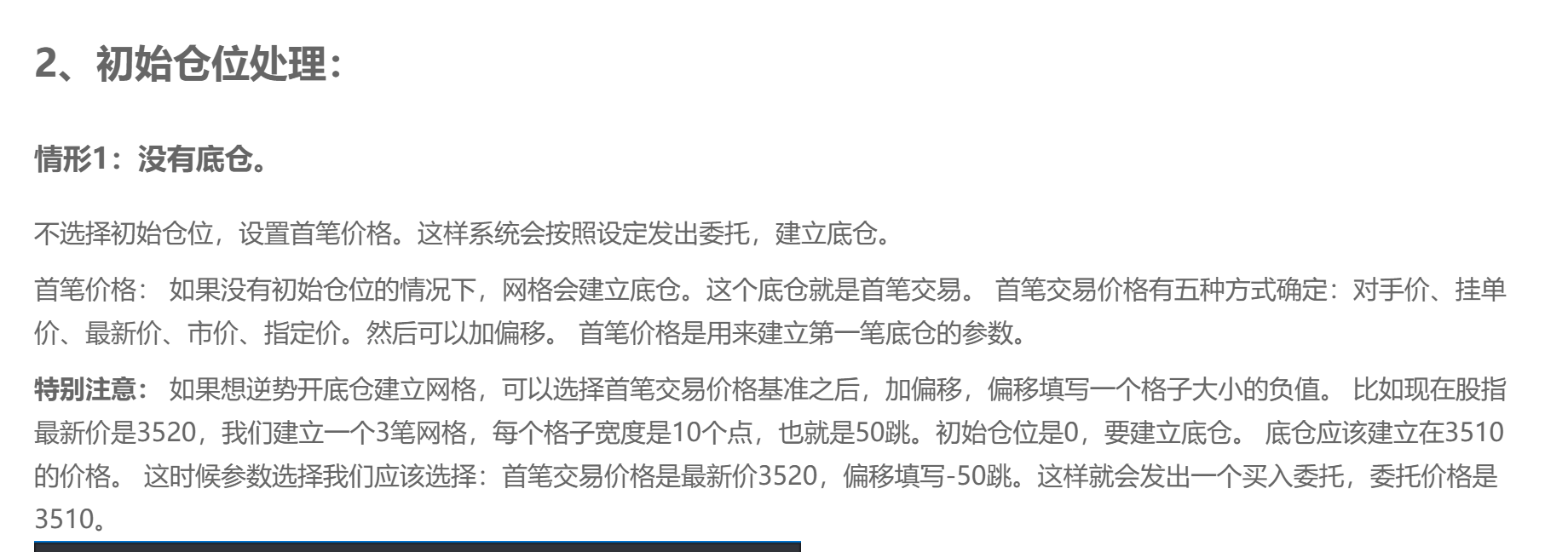 你好,网格交易按我实际底仓数量和成本设置好初始仓位后,如上,结果实时触发4笔挂单,2319卖平1手,2321卖平8手,2309买开1手,2316买开1手。不太明白这个逻辑。我理解初始仓位就是底仓,在此基础上向上平,向下开就可以了,向下开刀最大仓位为止,谢谢。