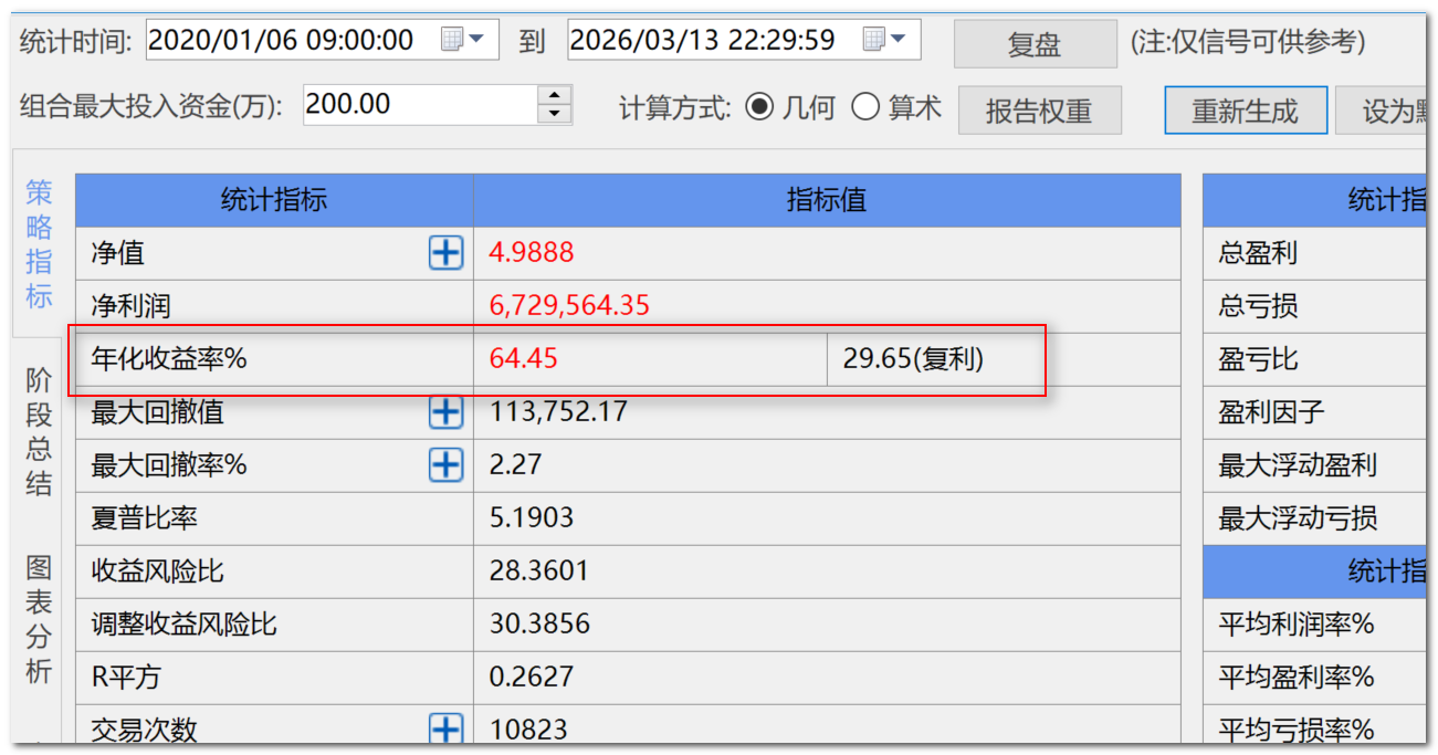 上图统计是近6年的策略回测报告,其中的年化收益率是64%,但我有个疑问,因为我的每个策略单元都是只开仓1手,一共50个策略单元,比如我第一年年初投入100w作为初始本金,这50个策略单元到年末有100%的收益(为了方便计算,这里把最初投入设置为100w,年化收益100%),即100w的利润,那在我什么都不改的情况下,第二年这50个开仓1手的策略单元按照年化100%难道第一年年末的200w到了第二年年末就能带来200w的利润(按照年化100%)?,甚至到了第三年年末,难到在本金变成400w的情况下这只每次开仓1手的策略单元能带来400w的利润?
