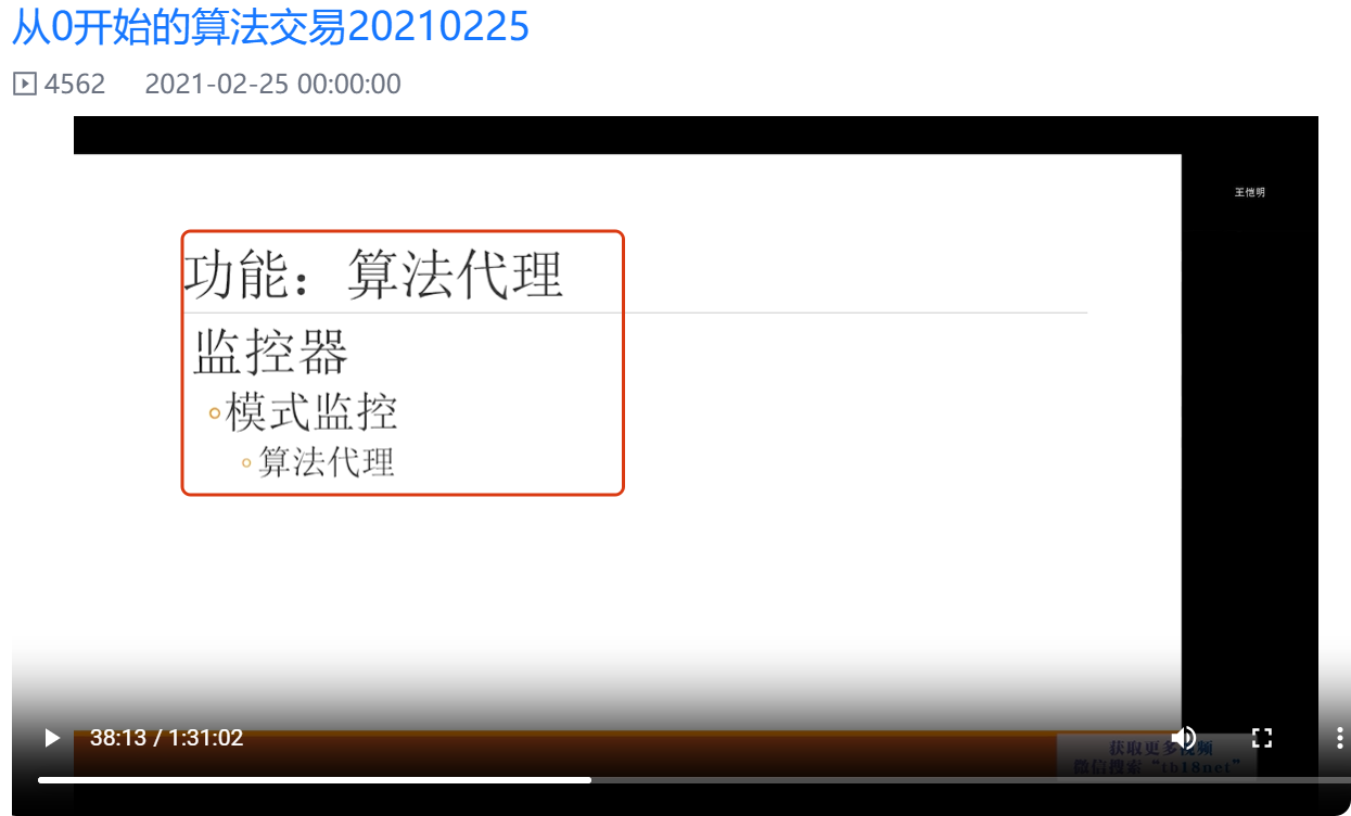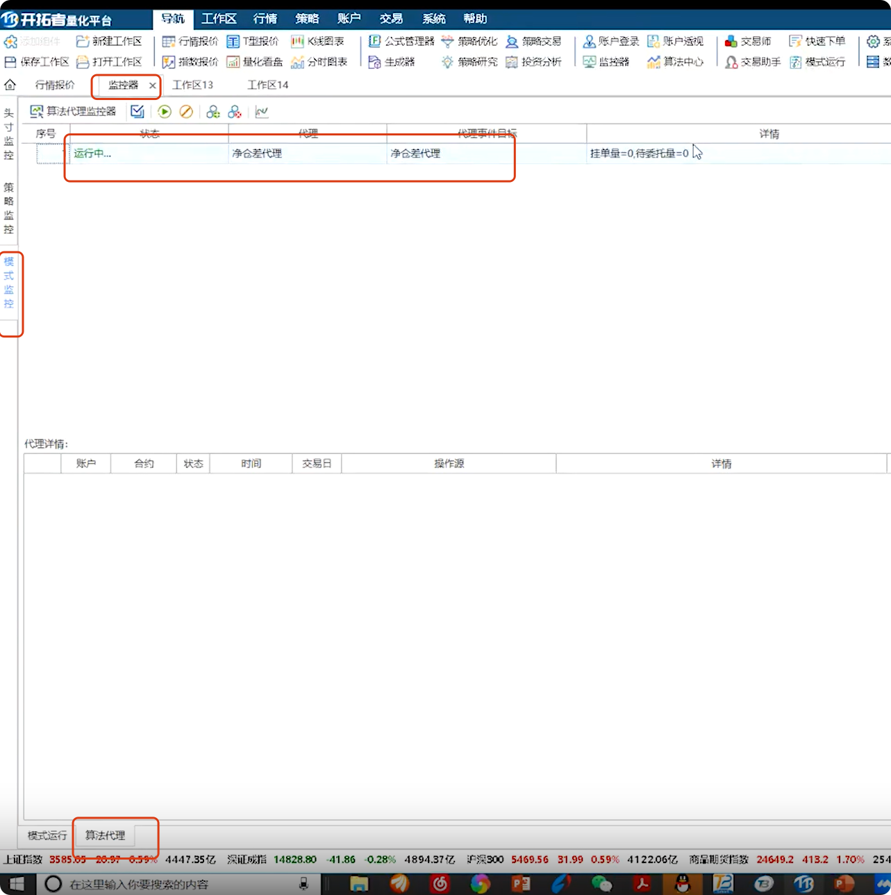 教学视频 从0开始的算法交易20210225 从第38分10秒开始讲解了一个使用算法代理下单的例子,操作步骤展示了如何使用【监控器】下【模式监控】下启动【算法代理】,如下图所示