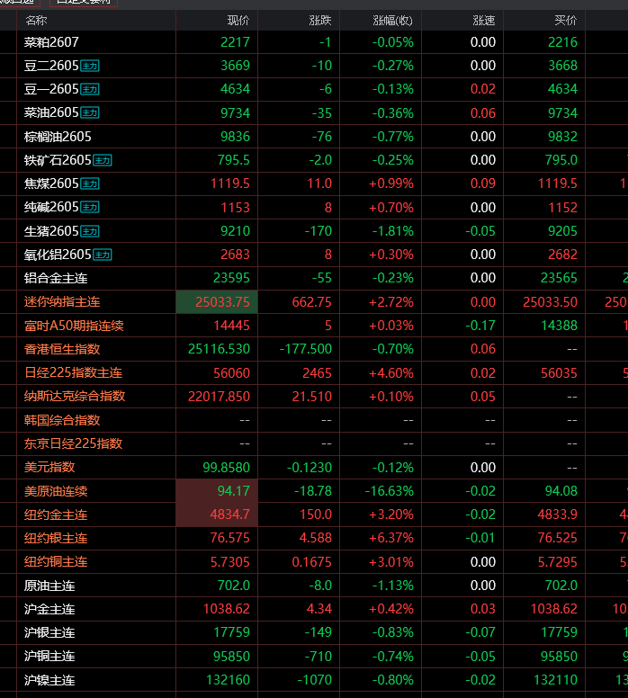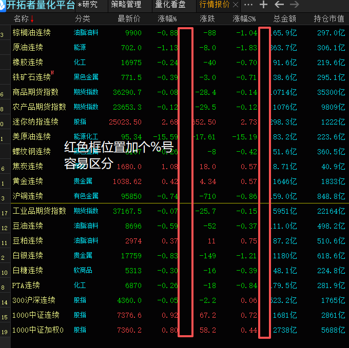 给行情报价提点个小建议,涨跌%,在横向报价位置加百分号比较容易区分,行情报价品种名加个可以自定义颜色
